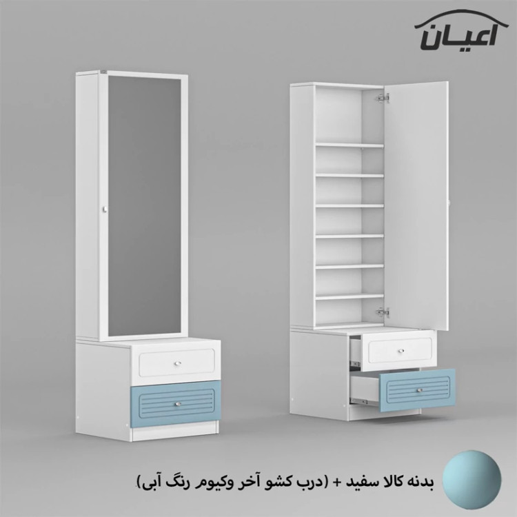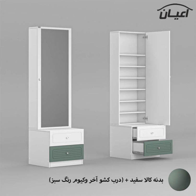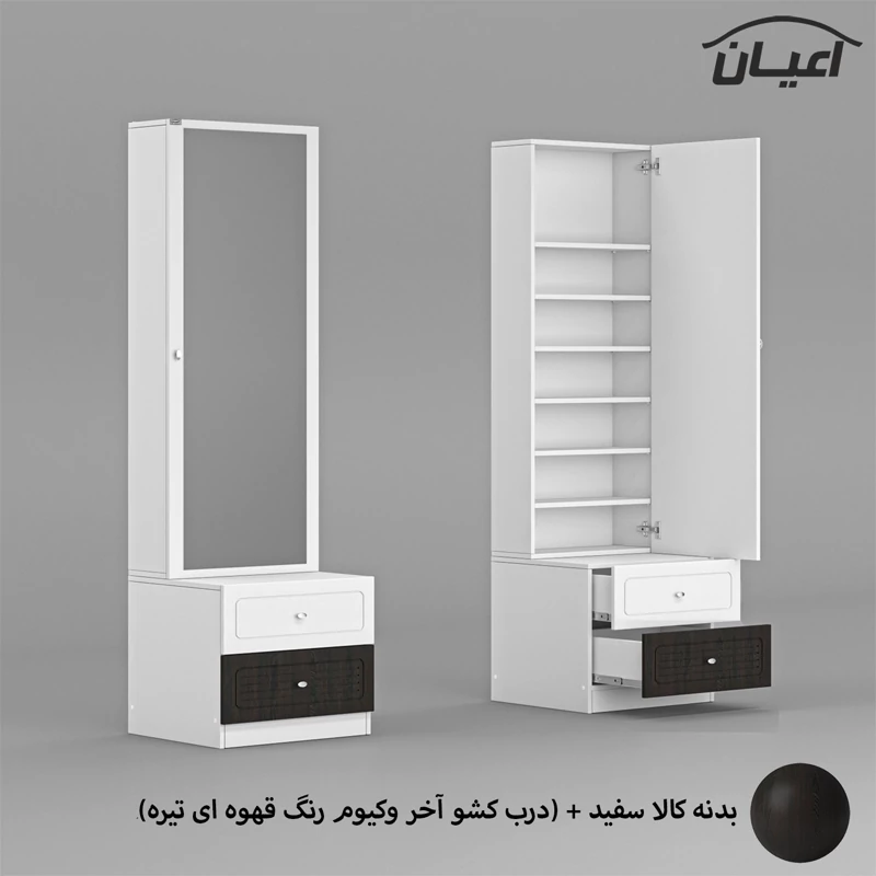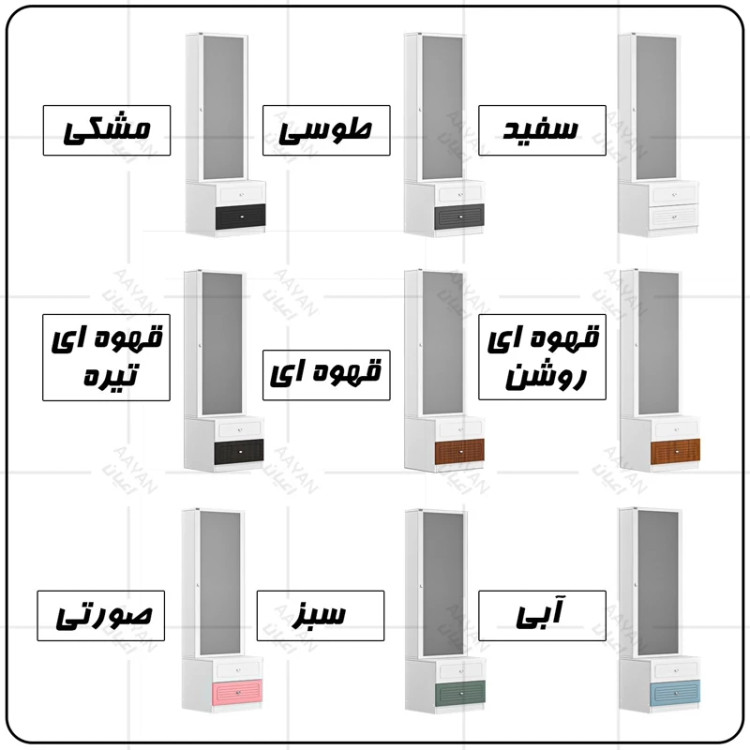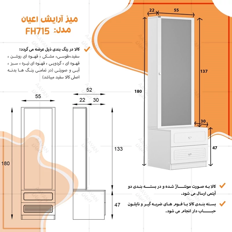 ست میز آرایش اعیان ، جنس بدنه : مغزی نئوپان با روکش ملامینه شرکتی ، کالا به صورت دوتکه می باشد :(که شامل یک میز با دو کشو ، کشوها دارای ریل سه تکه می باشد ، جنس درب کشوها : مغزی ام دی اف با روکش وکیوم می باشد و یک باکس (استند) کمدی دارای شش طبقه و هفت فضای مجزا برای قرار دادن لوازم آرایشی (مطابق تصاویر) ) این کالا در رنگ بندی : سفید ، طوسی ، مشکی ، قهوه ای روشن ، قهوه ای(گردویی) ، قهوه ای تیره(ونگه) ، سبز ، آبی و صورتی تولید و عرضه می گردد.