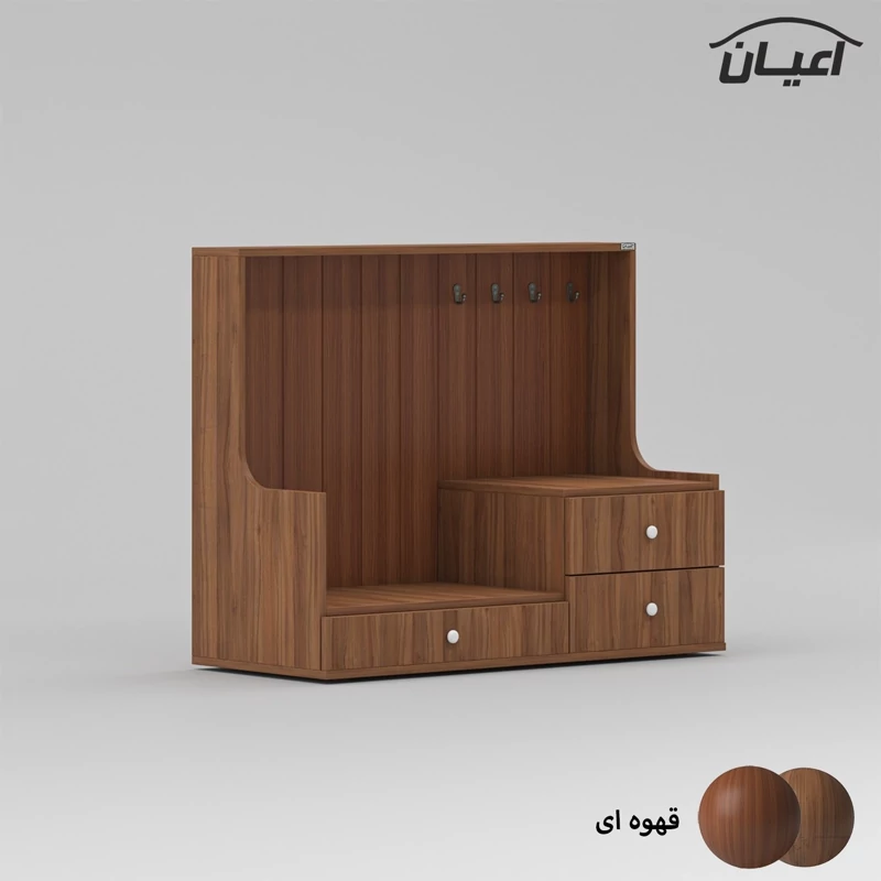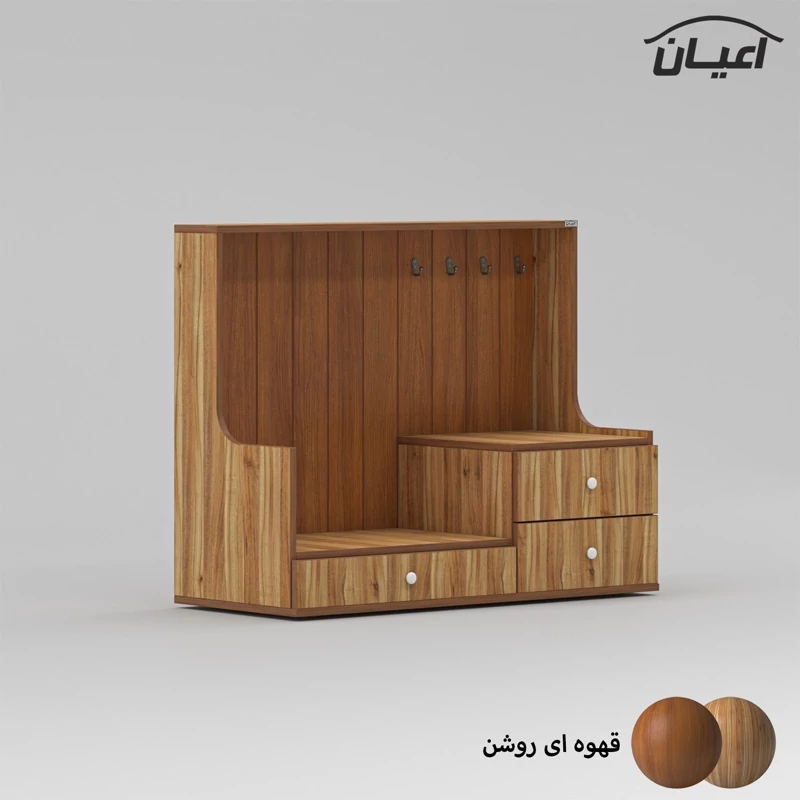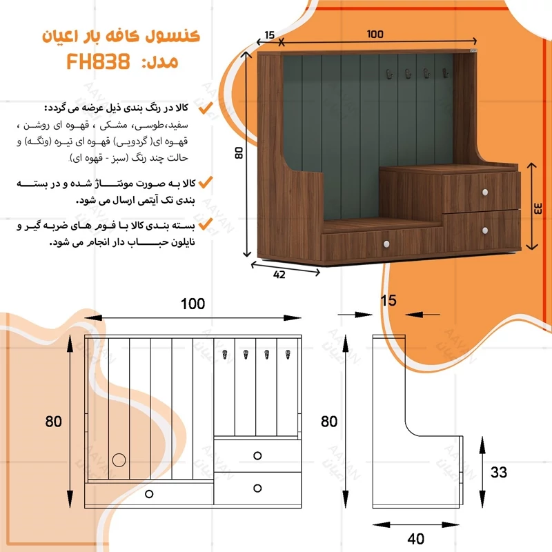 کنسول کافه بار اعیان ، جنس بدنه مغزی نئوپان با روکش ملامینه ، جنس نمای کار مغزی ام دی اف با روکش وکیوم و دارای طرح CNC، قسمت پایین کار دارای یک میز کار به حالت بازشوی کشویی و دو کشو با بازشوی ریل سه تکه ساچمه ای می باشد ، کالا دارای 4 عدد آویز لیوان می باشد ، دستگیره های کار به صورت توپی و به رنگ سفید می باشد،کالا دارای سیستم مدیریت کابل (جاکابلی) در نمای کار می باشد ، این کالا با رنگ بندی : ( سفید ، طوسی ، مشکی ، قهوه ای روشن ، قهوه ای (گردویی)، قهوه ای تیره (ونگه) و حالت چند رنگ (قهوه ای ، سبز) تولید و عرضه می گردد ، لطفا توجه داشته باشید که همواره چند درجه اختلاف رنگ بین تصاویر بارگذاری شده و کالای ساخته شده وجود دارد.