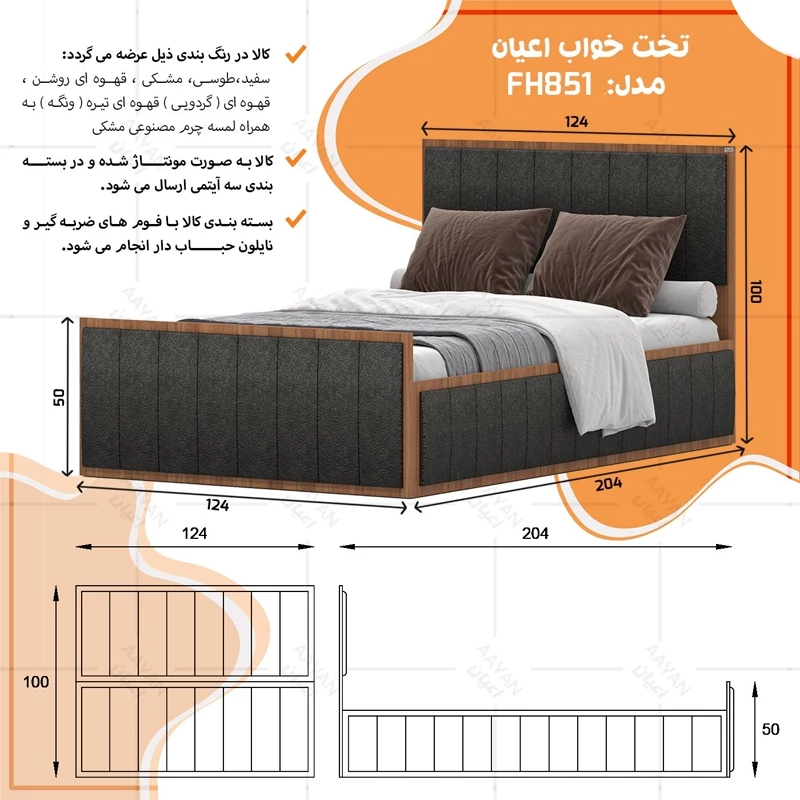 تخت خواب یک نفره اعیان مدل FH851 سایز 120x200 سانتی متر (پس کرایه)