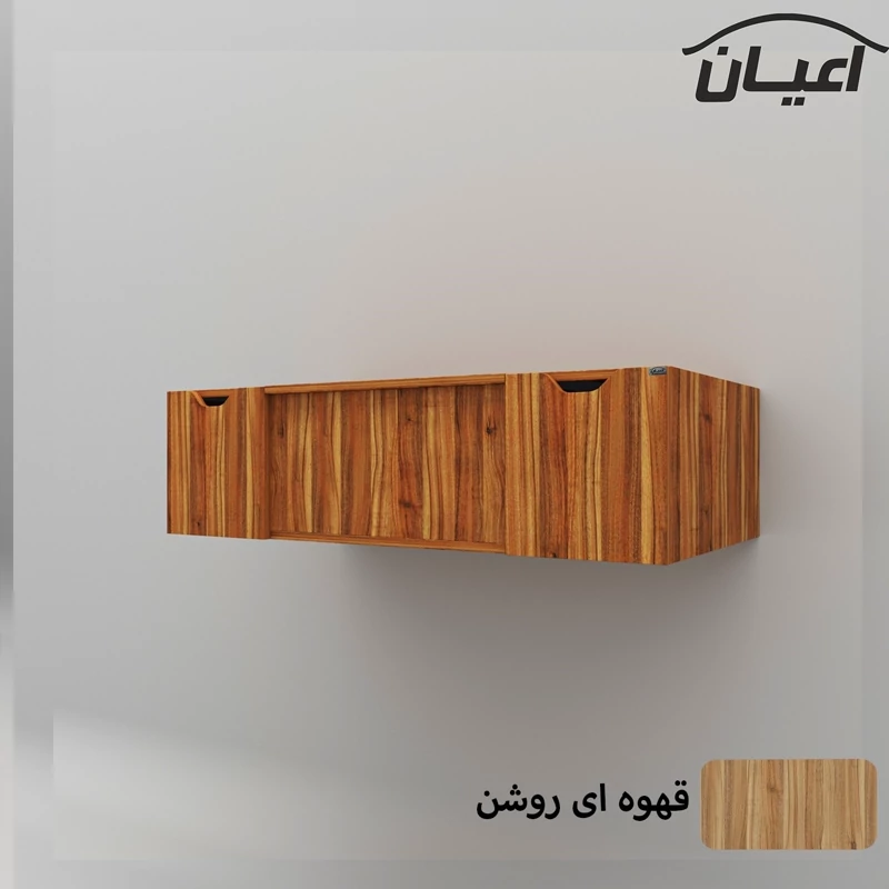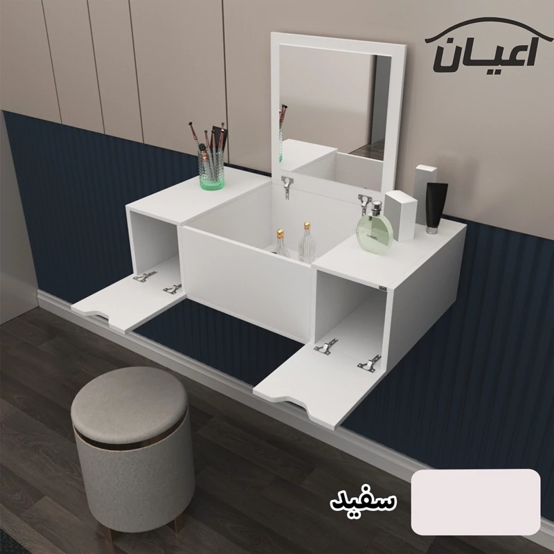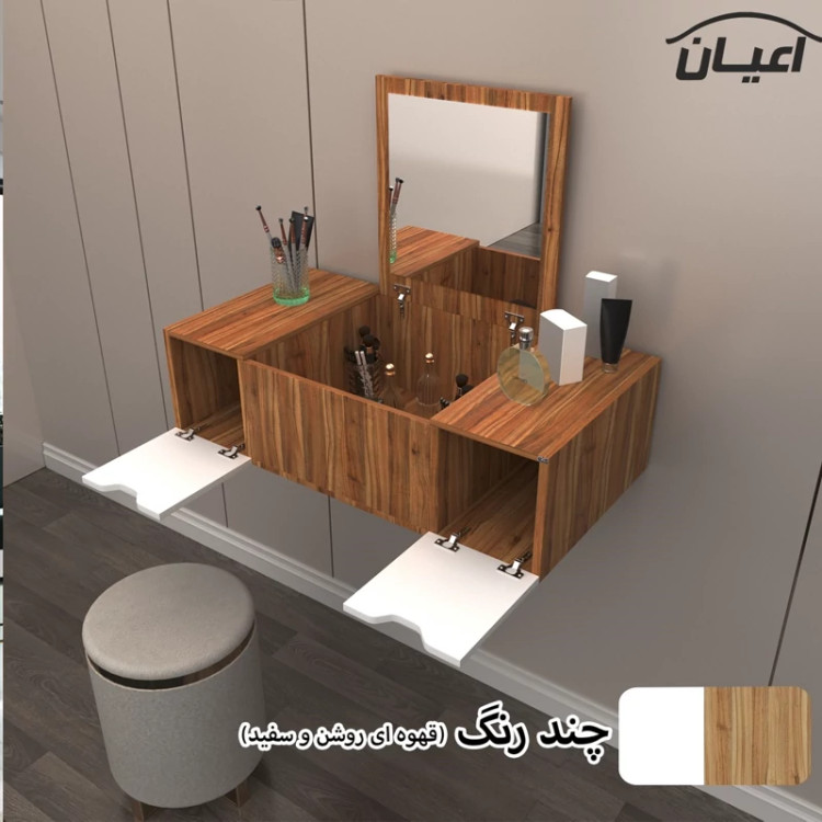 میز آرایش دیواری اعیان- جنس نئوپان ملامینه شرکتی-دارای سه درب داشبوردی -درب وسط دارای آینه می باشد- درب ها به صورت آرام بند-ساده و کاربردی. رنگ بندی کالا در آلبوم قابل مشاهده است(در رنگ های سفید/مشکی/قهوه ای/قهوه ای روشن/قهوه ای تیره (ونگه)و چند رنگ (قهوه ای روشن و سفید)تولید می شود) -