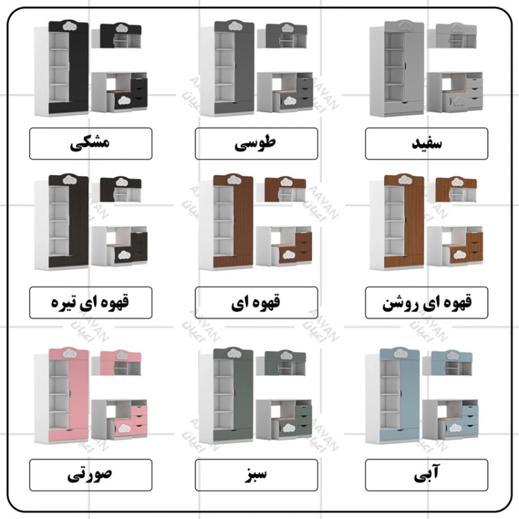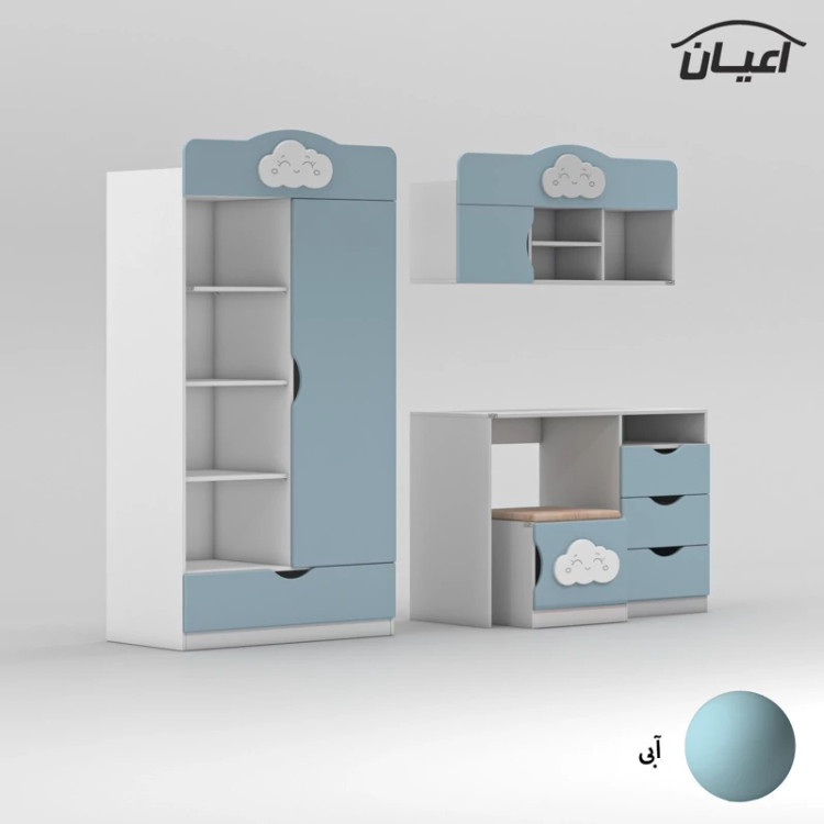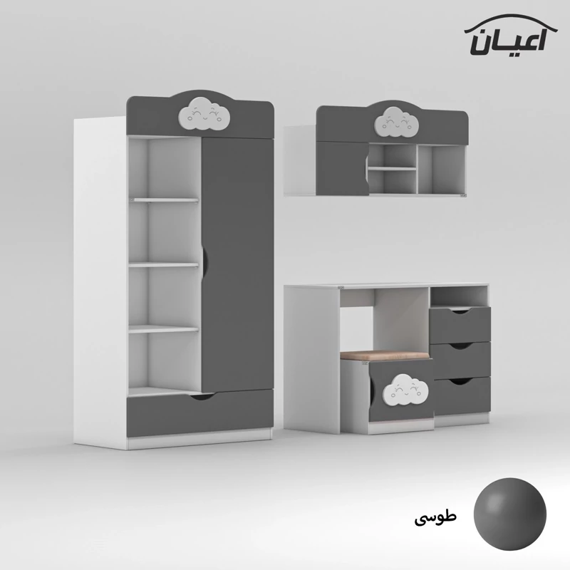 آیتم 1 : کمد لباس کودک و نوجوان اعیان طرح ابر ، جنس درب کشو ، درب کمد و تاج کالا مغزی ام دی اف با روکش وکیوم است ، جنس بدنه کالا مغزی نئوپان با روکش ملامینه ، دارای یک کشو با بازشوی ریل سه تکه ساچمه ای ، یک درب کمدی جهت آویز لباس و دارای سه طبقه و چهار فضای مجزا جهت استفاده به عنوان شلف و کتابخانه ، ارسال کمد به صورت مونتاژ شده و تک آیتمی می باشد