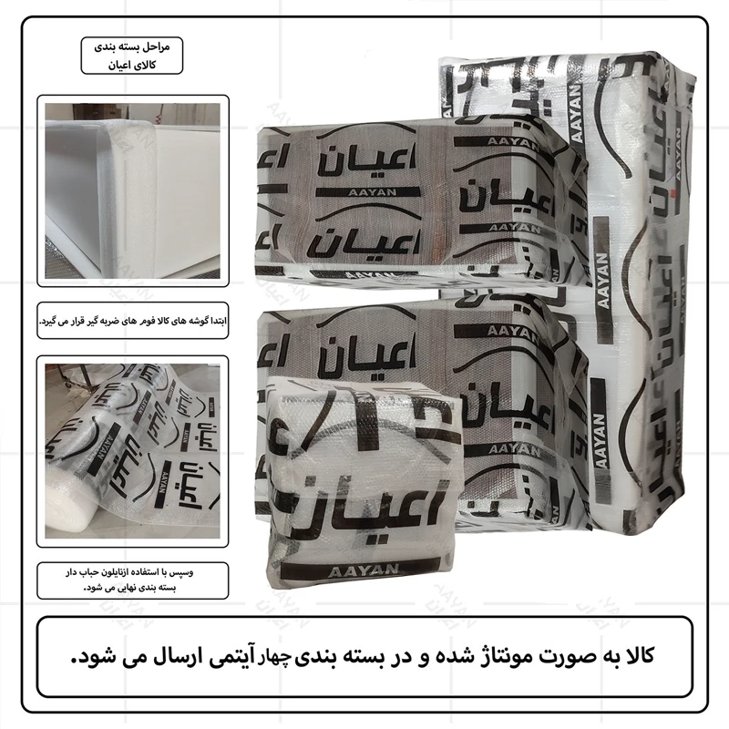 ارسال به صورت مونتاژ شده و سه آیتمی می باشد ، این کالا را فقط با برند و لوگو اعیان تهیه کنید ، این کالا در رنگ بندی (سفید، طوسی ، مشکی ، قهوه ای روشن ، قهوه ای(گردویی) ، قهوه ای تیره(ونگه) ، سبز ، آبی و صورتی) تولید و عرضه می شود. لطفا توجه فرمایید که همواره چند درجه اختلاف رنگ بین تصاویر بارگذاری شده و کالای ساخته شده وجود دارد.