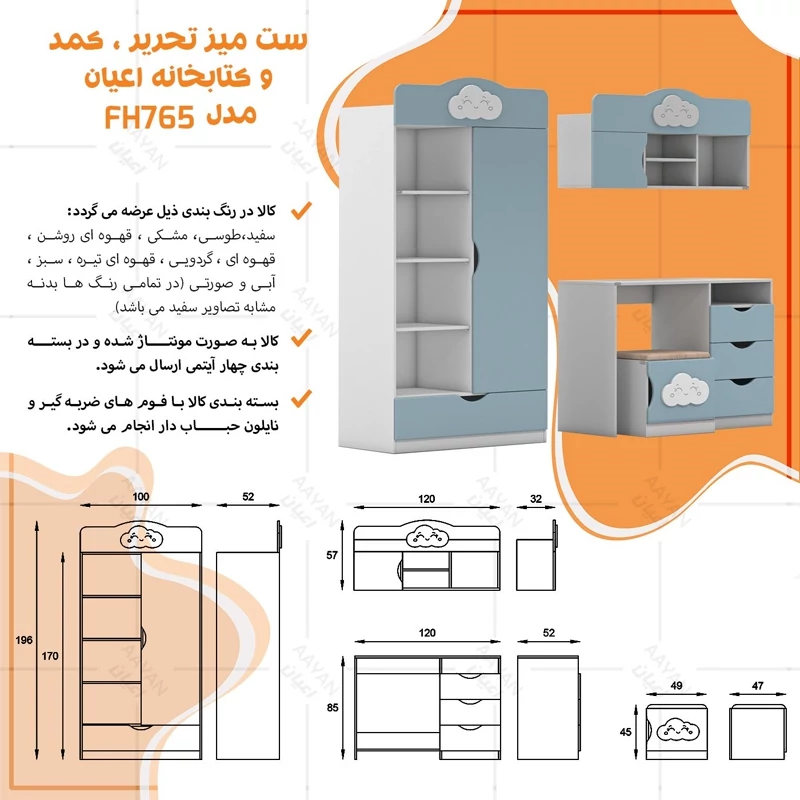 کمد کودک اعیان مدل FH765 به همراه میز تحریر و صندلی و کتابخانه مجموعه 4عددی(ارسال با باربری - هزینه ارسال پس کرایه)