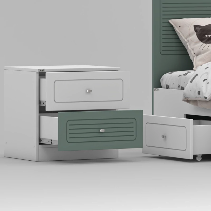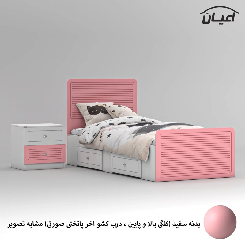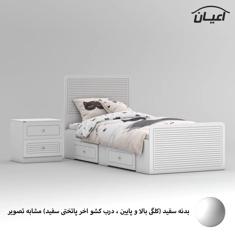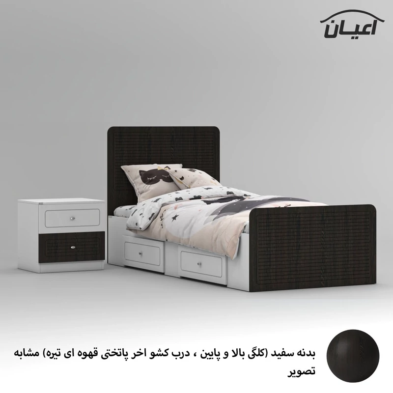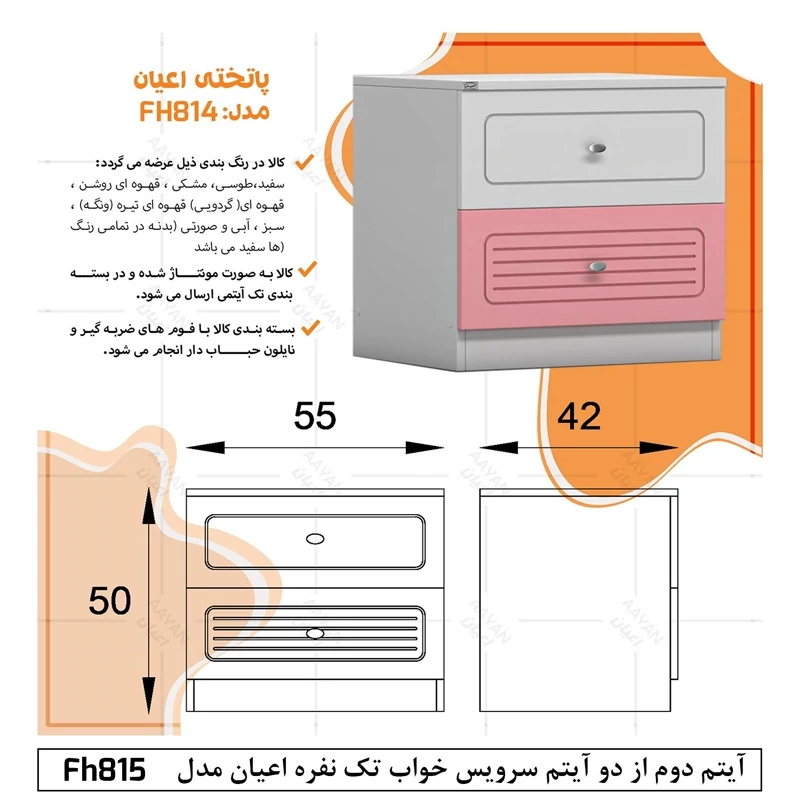 سرویس خواب یک نفره اعیان مجموعه دو عددی - آیتم اول : تخت خواب یک نفره اعیان ، جنس بدنه (بغل تخت ها) مغزی نئوپان با روکش ملامینه ، جنس کلگی بالا و پایین و درب کشو ها مغزی ام دی اف با روکش وکیوم شرکتی و دارای طرح سی ان سی است ، همچنین دارای دو کشو با چرخ ساکی بوده که قابلیت جابجایی دارند، کفی کار نئوپان بوده و همراه با چند جفت پایه متحرک ارسال می گردد، کالا فاقد تشک می باشد ، تشک مناسب این کار سایز 90x200 سانتی متر است، ارسال کالا به صورت مونتاژ نشده و در بسته بندی چهار آیتمی صورت میگرد ، آیتم دوم : پاتختی اعیان ، جنس درب کشوها : مغزی ام دی اف با روکش وکیوم است ، جنس بدنه کالا مغزی نئوپان با روکش ملامینه ، دارای دو کشو با بازشوی ریل سه تکه ساچمه ای ، ارسال به صورت مونتاژ شده است ، در نظر داشته باشید دستگیره های محصول (تخت خواب و پاتختی) به صورت تک پیچ استیل است و برای حفظ سلامت کالا و بسته بندی این دستگیره ها از داخل بسته می شود لطفا پس از بازکردن کار با استفاده از پیچ گوشتی جهت آن را تغییر دهید.این کالا را فقط با برند و لوگو اعیان تهیه کنید ، این کالا در رنگ بندی (سفید، طوسی ، مشکی ، قهوه ای روشن ، قهوه ای(گردویی) ، قهوه ای تیره(ونگه) ، سبز ، آبی و صورتی) تولید و عرضه می شود. بدنه ی کالا در تمامی رنگ ها سفید می باشد(کاملا مشابه تصاویر)، لطفا توجه فرمایید که همواره چند درجه اختلاف رنگ بین تصاویر بارگذاری شده و کالای ساخته شده وجود دارد. برای مشاهده و خرید تخت خواب به صورت جداگانه کد FH810 و برای مشاهده و خرید پاتختی به صورت جداگانه کد FH814 را انتخاب کنید.