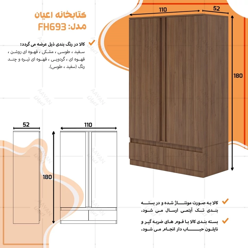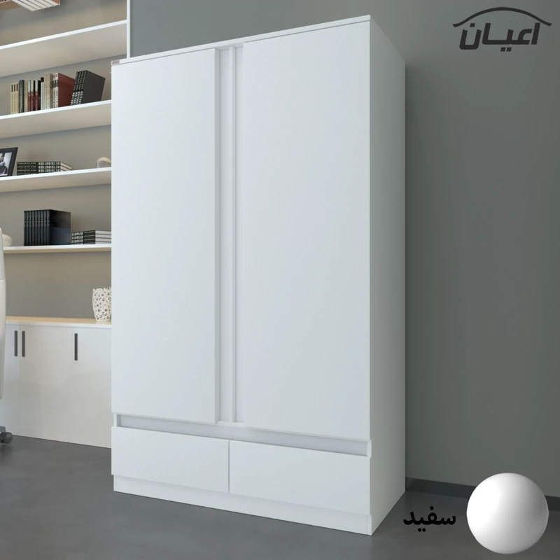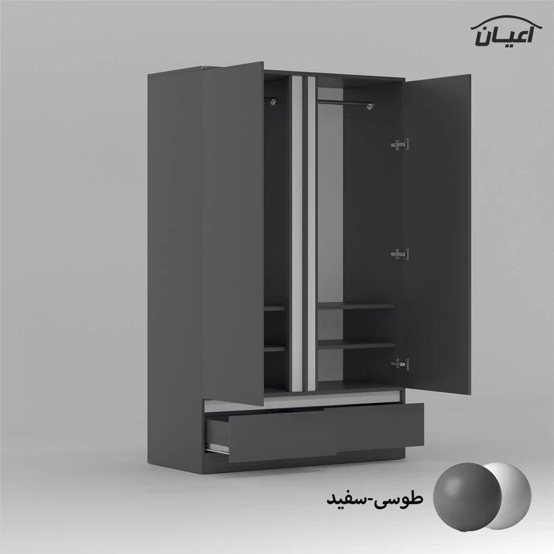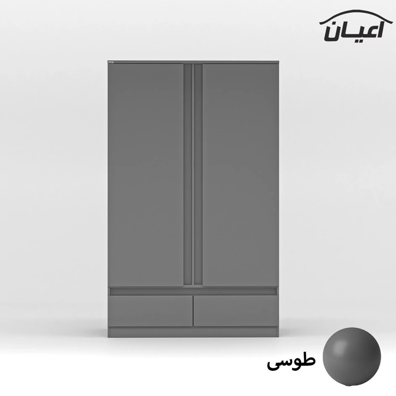 کمد لباس اعیان-جنس:نئوپان ملامینه-دارای دو درب کمدی -دستگیره مخفی-دارای چهار طبقه متحرک-درب ها به صورت آرام بند-دارای دو کشو با ریل سه تکه-دارای دو عدد میله رگال جهت آویز لباس - طراحی مدرن و استاندارد- رنگبندی کالا:سفید/مشکی/قهوه ای(گردویی)/قهوه ای روشن/قهوه ای تیره/طوسی/چند رنگ(طوسی-سفید)-رنگ بندی کالا در آلبوم قابل مشاهده است-کالا به صورت مونتاژ شده و در بسته بندی تک آیتمی ارسال می شود.