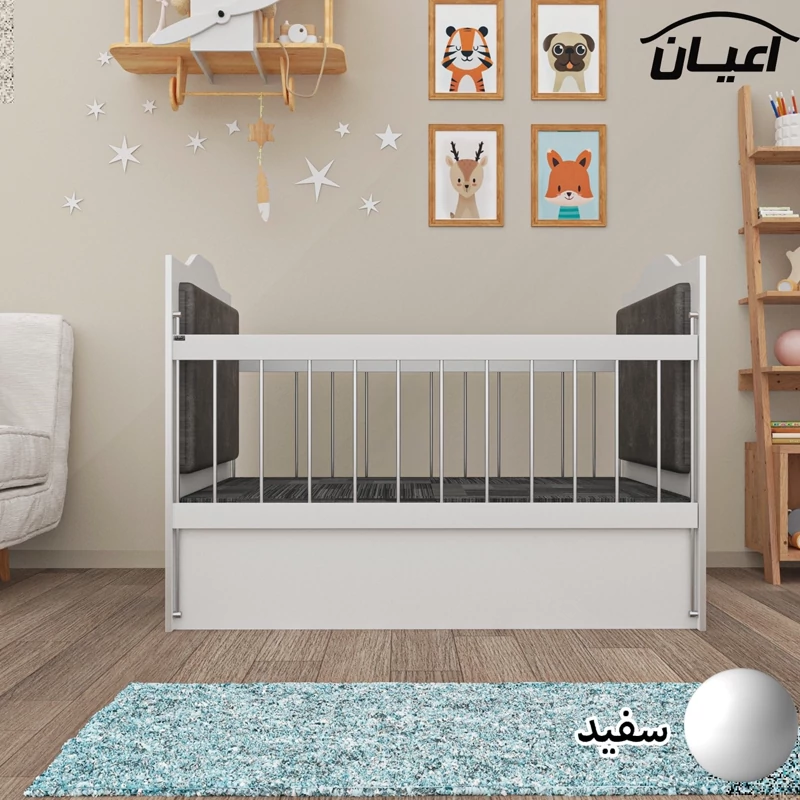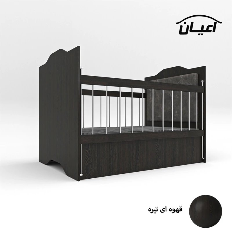 تخت خواب کودک اعیان.جنس نئوپان ملامینه شرکتی.کلگی هااز داخل دارای لمسه است.جنس لمسه پارجه مبلی رنگ طوسی است.