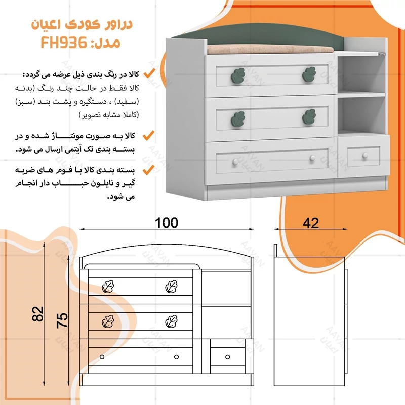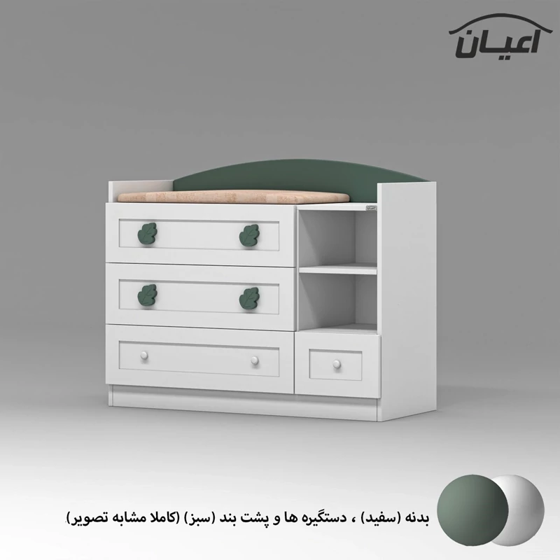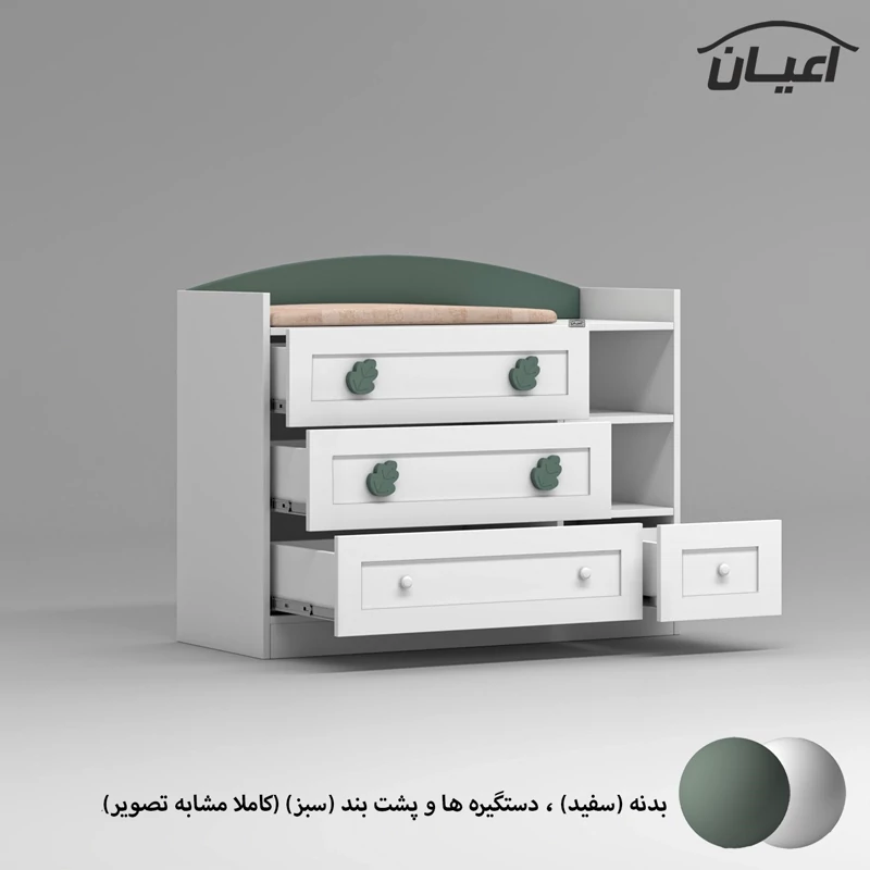 دراور اعیان ، جنس بدنه : مغزی نئوپان با روکش ملامینه ، جنس درب ها و پشت بند رنگی کالا مغزی ام دی اف با روکش وکیوم ، دارای چهار کشو (سه کشوی بزرگ و یک کشوی کوچک) با بازشوی ریل سه تکه ساچمه ای و دو قفسه می باشد ، دستگیره ها به شکل برگ و از جنس ام دی اف می باشد ، دستگیره ی دو کشو آخر توپی سفید می باشد ، روی کار دارای یک لمسه کرمی رنگ از جنس مخمل جهت (تعویض پوشک کودک) می باشد، این کالا فقط در حالت چند رنگ (بدنه (سفید) پشت بند و دستگیره ها (سبز) و لمسه ی کرمی ) تولید و عرضه می گردد، این کالا را فقط با برند و لوگوی اعیان تهیه کنید ، لطفا توجه فرمایید که همواره چند درجه اختلاف رنگ بین تصاویر بارگزاری شده و کالا وجود دارد.