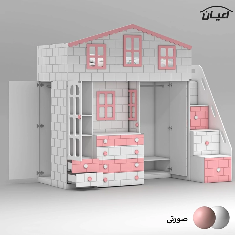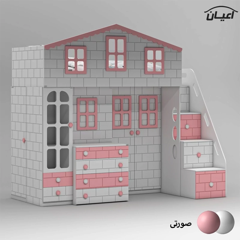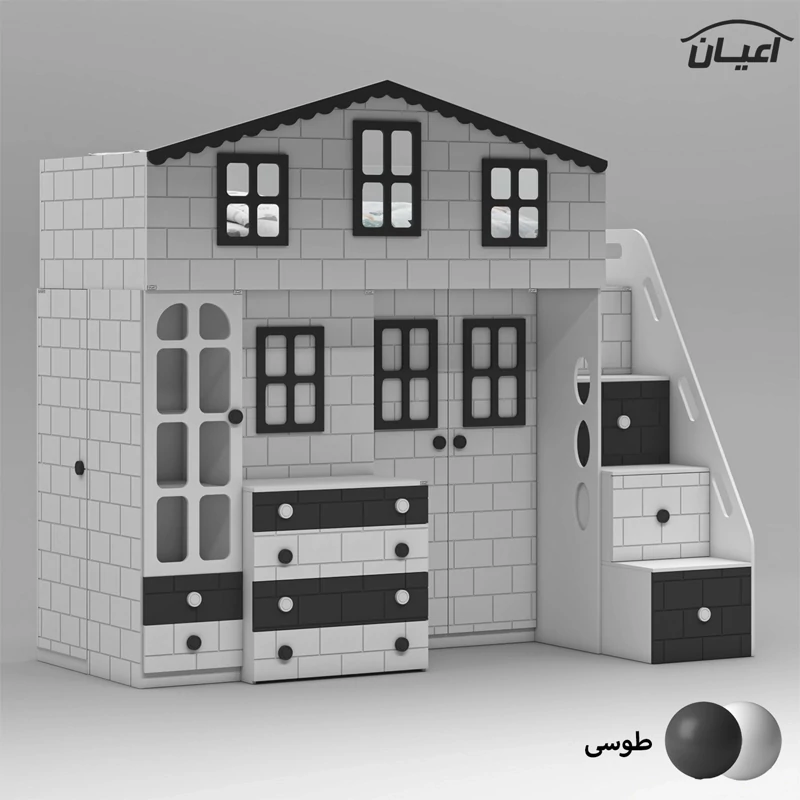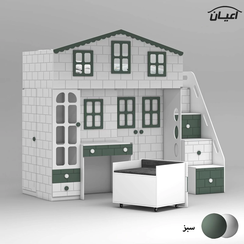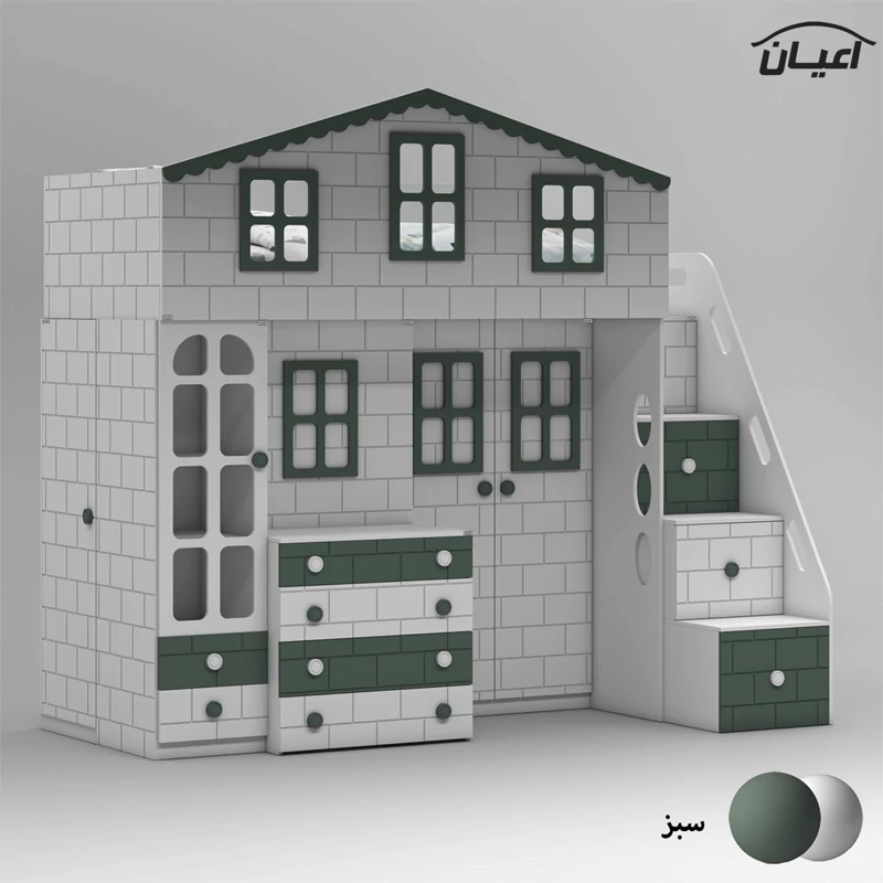 تخت خواب چند منظوره دوطبقه اعیان طرح کلبه : جنس مغزی نئوپان با روکش ملامینه + مغزی ام دی اف با روکش وکیوم آیتم اول : یک عدد کتابخانه درب دار ویترینی با بازشوی لولای آرام بند ، دارای دو طبقه و سه فضا جهت قرار دادن کتاب و اکسسوری ، دو عدد کشو با بازشوی ریل سه تکه ساچمه ای آیتم دوم : یک عدد باکس نشیمن دار (نشیمن دارای لمسه طوسی رنگ می باشد) ، دارای دو کشو با بازشوی ریل سه تکه ساچمه ای آیتم سوم : یک عدد میز آرایش دو آیتمی (آیتم اول : میز آرایش ، دارای یک کشو با بازشوی ریل سه تکه ساچمه ای ، آیتم دوم : باکس آینه دار ، دارای چهار طبقه و شش فضای کوچک برای قرار دادن لوازم آرایشی و اکسسوری) آیتم چهارم : یک عدد کمد لباس دو درب با بازشوی لولای آرام بند ، دارای رگال لباس و یک عدد طبقه متحرک آیتم پنجم ، پله ها ، چهار پله که هر پله دارای یک کشو با بازشوی ریل سه تکه ساچمه ای می باشد آیتم ششم : تخت خواب تک نفره سایز 90*200 سانتی متر (فاقد تشک ، تشک مناسب 90*200 سانتی متر) آیتم هفتم : یک عدد کمد لباس تک درب با بازشوی لولای آرام بند، دارای یک رگال لباس و چهار طبقه و پنج فضا (جهت استفاده به عنوان انباری برای لباس های فصلی) این کالا به صورت مونتاژ شده (فیکس نشده) و در بسته بندی 14 آیتمی ارسال می شود که شما باید با توجه به محل مشخص شده جهت اتصال و پیچ های فیکس ارسالی توسط مجموعه قطعات را بهم متصل کنید ، این کالا در رنگ بندی :(سفید ، طوسی ، مشکی ، قهوه ای روشن ، قهوه ای(گردویی) ، قهوه ای تیره(ونگه) ، سبز ، آبی و صورتی تولید و عرضه میگردد (لطفا توجه داشته باشید که در تمامی رنگ ها معیار انتخاب رنگ ، قسمت های رنگی کالا بوده و مابقی قسمت ها تماما سفید می باشد (کاملا مشابه تصاویر) ، این کالا را فقط با لوگو و برند اعیان تهیه کنید، لطفا توجه داشته باشید که همواره چند درجه اختلاف رنگ بین تصاویر بارگذاری شده و کالای ساخته شده وجود دارد.