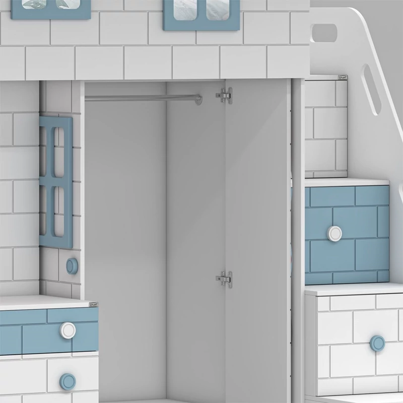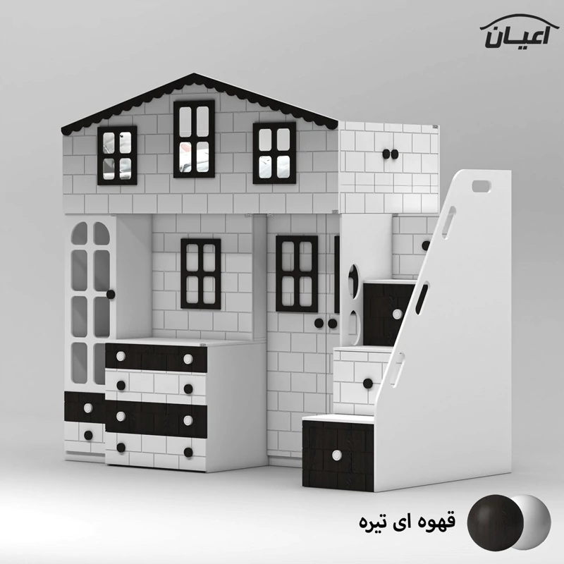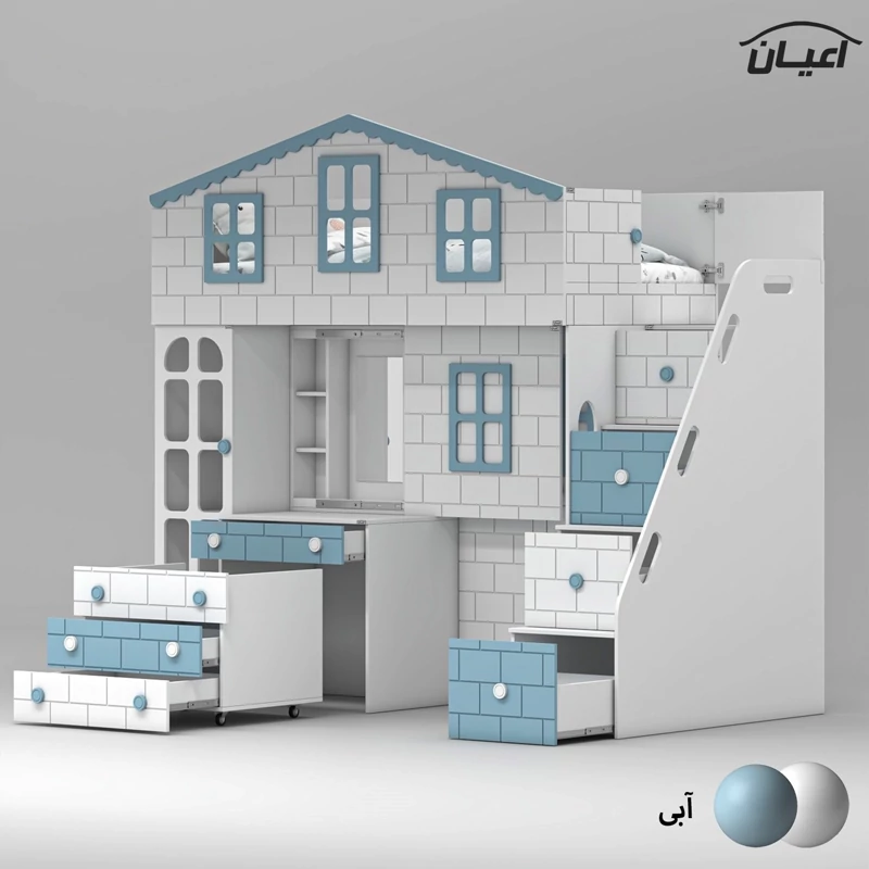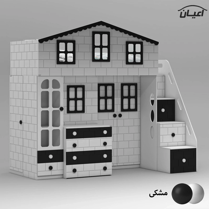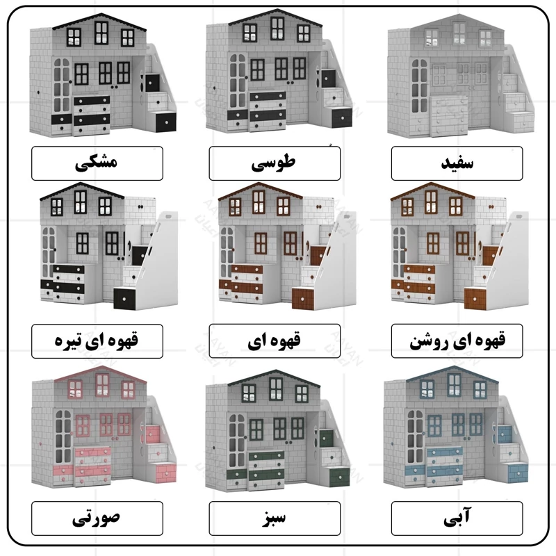 تخت خواب چند منظوره دوطبقه اعیان طرح کلبه : جنس مغزی نئوپان با روکش ملامینه + مغزی ام دی اف با روکش وکیوم آیتم اول : یک عدد کتابخانه درب دار ویترینی با بازشوی لولای آرام بند ، دارای دو طبقه و سه فضا جهت قرار دادن کتاب و اکسسوری ، دو عدد کشو با بازشوی ریل سه تکه ساچمه ای آیتم دوم : یک عدد باکس نشیمن دار (نشیمن دارای لمسه طوسی رنگ می باشد) ، دارای دو کشو با بازشوی ریل سه تکه ساچمه ای آیتم سوم : یک عدد میز آرایش دو آیتمی (آیتم اول : میز آرایش ، دارای یک کشو با بازشوی ریل سه تکه ساچمه ای ، آیتم دوم : باکس آینه دار ، دارای چهار طبقه و شش فضای کوچک برای قرار دادن لوازم آرایشی و اکسسوری) آیتم چهارم : یک عدد کمد لباس دو درب با بازشوی لولای آرام بند ، دارای رگال لباس و یک عدد طبقه متحرک آیتم پنجم ، پله ها ، چهار پله که هر پله دارای یک کشو با بازشوی ریل سه تکه ساچمه ای می باشد آیتم ششم : تخت خواب تک نفره سایز 90*200 سانتی متر (فاقد تشک ، تشک مناسب 90*200 سانتی متر) آیتم هفتم : یک عدد کمد لباس تک درب با بازشوی لولای آرام بند، دارای یک رگال لباس و چهار طبقه و پنج فضا (جهت استفاده به عنوان انباری برای لباس های فصلی) این کالا به صورت مونتاژ شده (فیکس نشده) و در بسته بندی 14 آیتمی ارسال می شود که شما باید با توجه به محل مشخص شده جهت اتصال و پیچ های فیکس ارسالی توسط مجموعه قطعات را بهم متصل کنید ، این کالا در رنگ بندی :(سفید ، طوسی ، مشکی ، قهوه ای روشن ، قهوه ای(گردویی) ، قهوه ای تیره(ونگه) ، سبز ، آبی و صورتی تولید و عرضه میگردد (لطفا توجه داشته باشید که در تمامی رنگ ها معیار انتخاب رنگ ، قسمت های رنگی کالا بوده و مابقی قسمت ها تماما سفید می باشد (کاملا مشابه تصاویر) ، این کالا را فقط با لوگو و برند اعیان تهیه کنید، لطفا توجه داشته باشید که همواره چند درجه اختلاف رنگ بین تصاویر بارگذاری شده و کالای ساخته شده وجود دارد.