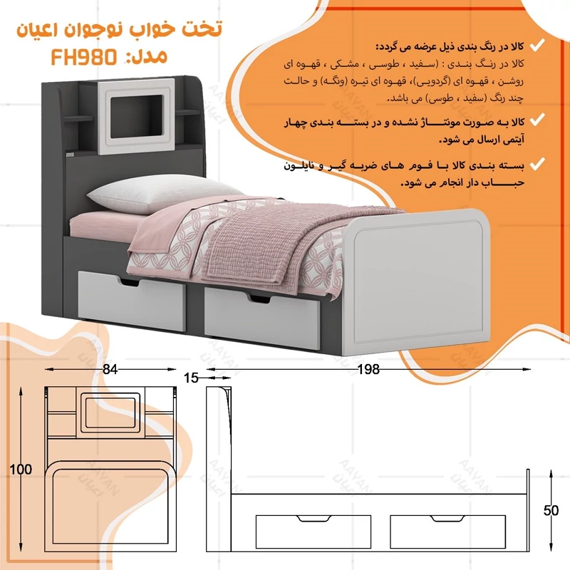 تخت خواب نوجوان اعیان ، جنس مغزی نئوپان با روکش ملامینه ، جنس کلگی پایین و نمای کلگی بالا مغزی ام دی اف با روکش وکیوم (دارای طرح cnc ساده) ، دارای دو کشو با بازشوی چرخ چمدانی (ساکی) دستگیره های کشو به شکل cnc طراحی شده است ، کلگی بالا به صورت باکس طراحی شده و دارای یک محفظه جدا و دو طبقه و چهار فضای کوچک در دو طرف جهت قراردادن اکسسوری می باشد ، کفی کار به صورت دو تکه بوده و به همراه چند جفت پایه متحرک ارسال می شود ، کالا فاقد تشک می باشد ، سایز تشک مناسب برای تخت خواب (180×80 سانتی متر) است ، این کالا با رنگ بندی (سفید ، طوسی ، مشکی ، قهوه ای روشن ، قهوه ای (گردویی) ، قهوه ای تیره (ونگه) و حالت چند رنگ (سفید،طوسی) تولید و عرضه می شود ، لطفا توجه داشته باشید که همواره چند درجه اختلاف رنگ بین تصاویر بارگذاری شده و کالای ساخته شده وجود دارد.