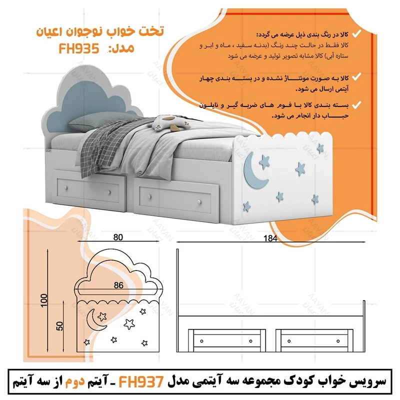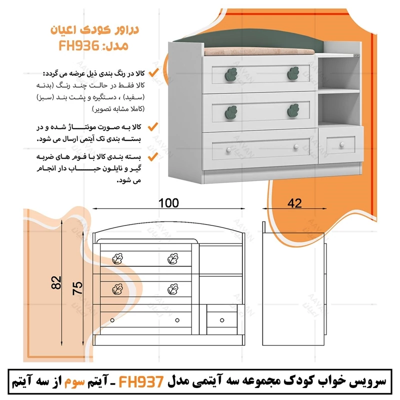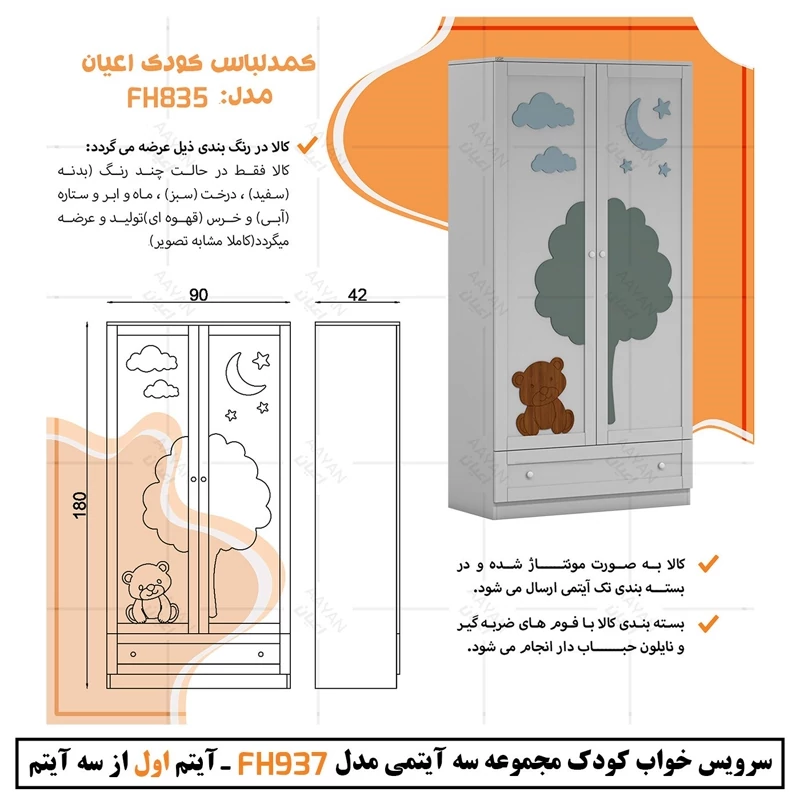سرویس خواب کودک و نوزاد سه آیتمی آیتم اول : کمد لباس کودک اعیان ، جنس بدنه مغزی نئوپان با روکش ملامینه و جنس درب کشوها و درب های کمدی مغزی MDF با روکش وکیوم و همچنین نمای روی درب ها مغزی سه میل با روکش وکیوم است ، دارای دو درب کمدی با طرح آسمان و جنگل ، دارای رگال لباس و دو طبقه متحرک برای روی پین طبقه (قابل برداشتن) و یک کشو ، دستگیره های این کالا از جنس PVC و به شکل توپی می باشد ، این آیتم تنها در حالت چند رنگ ( بدنه و درب ها : سفید ، درخت : سبز ، ماه ، ابر ها و ستاره ها : آبی و خرس : قهوه ای ) تولید و عرضه می گردد. ایتم دوم : تخت خواب کودک و نوجوان اعیان ، جنس کلگی و درب کشو کالا ام دی اف با روکش وکیوم و جنس بغل تخت و کلاف داخلی کشوها نئوپان ملامینه ، طراحی ساده ، شیک و کودکانه (به شکل ابر) ، دارای دو کشو استاندارد با بازشوی چرخ چمدانی (چرخ ساکی) ، ارسال کالا به صورت مونتاژ نشده صورت می گیرد و نیاز به نصب دارد ، کالا فاقد تشک می باشد ، کفی نئوپان و به صورت دو تکه به همراه چند جفت پایه متحرک است ، سایز تشک مناسب برای تخت خواب(180×80 سانتی متر) است، این کالا فقط به صورت چند رنگ ( بدنه سفید و ماه و ابر و ستار ها آبی) تولید و عرضه می شود. آیتم سوم : دراور اعیان ، جنس بدنه : مغزی نئوپان با روکش ملامینه ، جنس درب ها و پشت بند رنگی کالا مغزی ام دی اف با روکش وکیوم ، دارای چهار کشو (سه کشوی بزرگ و یک کشوی کوچک) با بازشوی ریل سه تکه ساچمه ای و دو قفسه می باشد ، دستگیره ها به شکل برگ و از جنس ام دی اف می باشد ، دستگیره ی دو کشو آخر توپی سفید می باشد ، روی کار دارای یک لمسه کرمی رنگ از جنس مخمل جهت (تعویض پوشک کودک) می باشد، این کالا فقط در حالت چند رنگ (بدنه (سفید) پشت بند و دستگیره ها (سبز) و لمسه ی کرمی ) تولید و عرضه می گردد. این کالا را فقط با لوگو و برند اعیان تهیه کنید، لطفا توجه داشته باشید که همواره چند درجه اختلاف رنگ بین تصاویر بارگذاری شده و کالای ساخته شده وجود دارد. برای تهیه کمد لباس کودک به تنهایی (آیتم اول) کد FH835 - تهیه تخت خواب به تنهایی (آیتم دوم) کد FH935 و تهیه دراور به تنهایی (آیتم سوم) کد FH936 را در پنل برند اعیان جست و جو و انتخاب کنید.