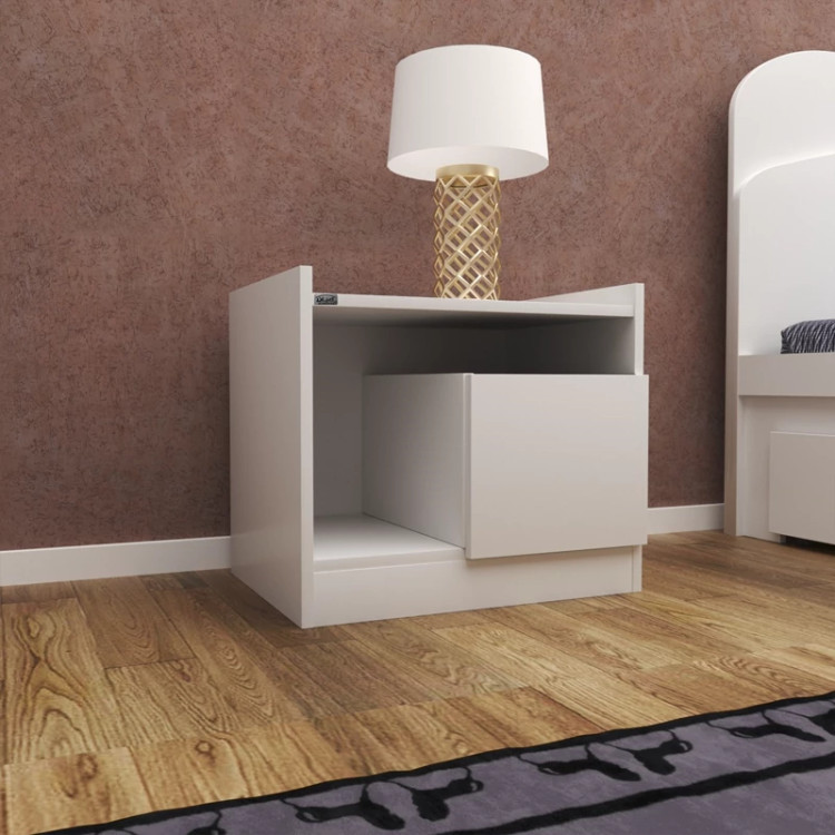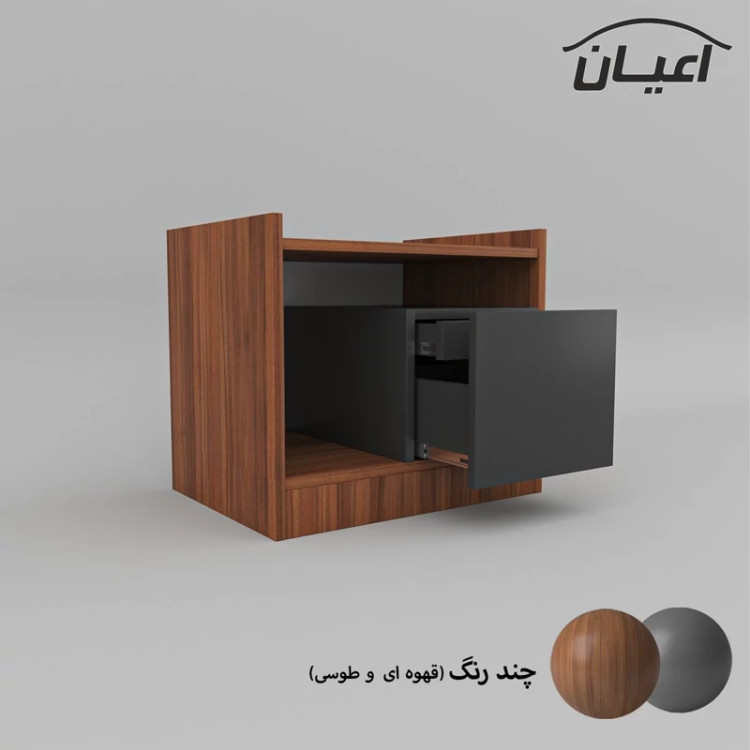 میز پاتختی اعیان-جنس نئوپان ملامینه شرکتی-دارای دو کشو با ریل ساچمه ای سه تکه -یک کشو در نما و یک کشو به صورت مخفی می باشد.