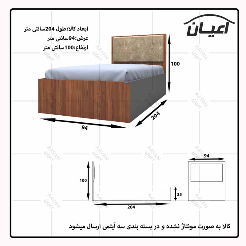 تخت خواب یک نفره اعیان.جنس نئوپان ملامینه شرکتی. کلگی دارای لمسه با پارچه مبلی کرم-کالا فاقد تشک می باشد. سایز تشک مناسب 90x200سانت است کالا به صورت مونتاژ نشده (جدا از هم) ارسال می شود -بسته بندی کالا به صورت سه آیتمی است - جنس کفی تخت نئوپان به صورت دو تکه است - رنگ بندی کالا در آلبوم قابل مشاهده است(در رنگ های سفید/مشکی/قهوه ای/قهوه ای روشن/قهوه ای تیره (ونگه)/گردویی/طوسی و چند رنگ(گردویی و طوسی) تولید می شود)-تنها در صورتی کالای انتخابی مطابق با تصاویر و مشخصات درج شده خواهد بود که هنگام انتخاب، فروشنده رسمی برند اعیان درباسلام را انتخاب نمایید. هنگام خرید و دریافت کالا به بسته بندی و لوگوی برند اعیان دقت فرمایید.
