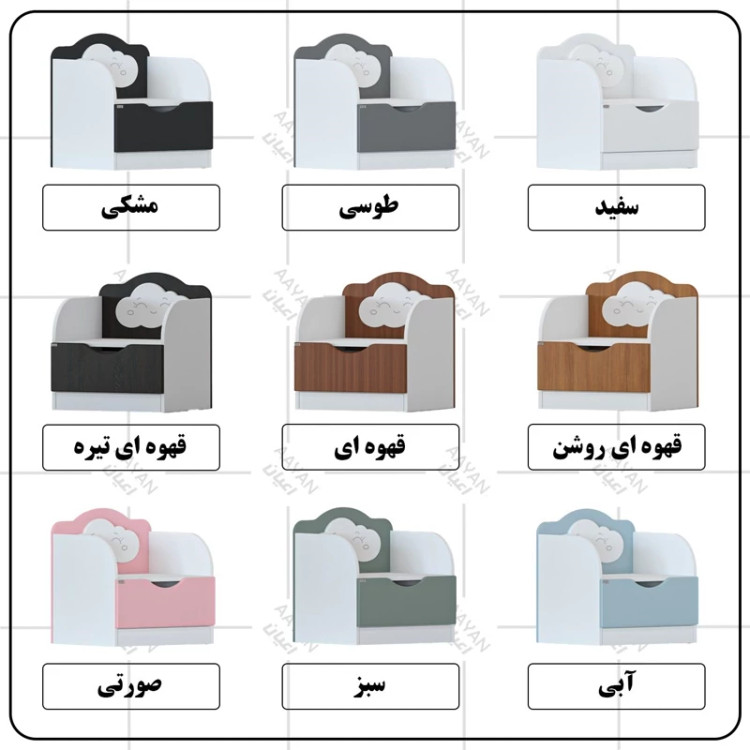 این کالا در رنگ بندی (سفید، طوسی ، مشکی ، قهوه ای روشن ، قهوه ای(گردویی) ، قهوه ای تیره(ونگه) ، سبز ، آبی و صورتی) تولید و عرضه می شود. لطفا توجه فرمایید که همواره چند درجه اختلاف رنگ بین تصاویر بارگذاری شده و کالای ساخته شده وجود دارد.