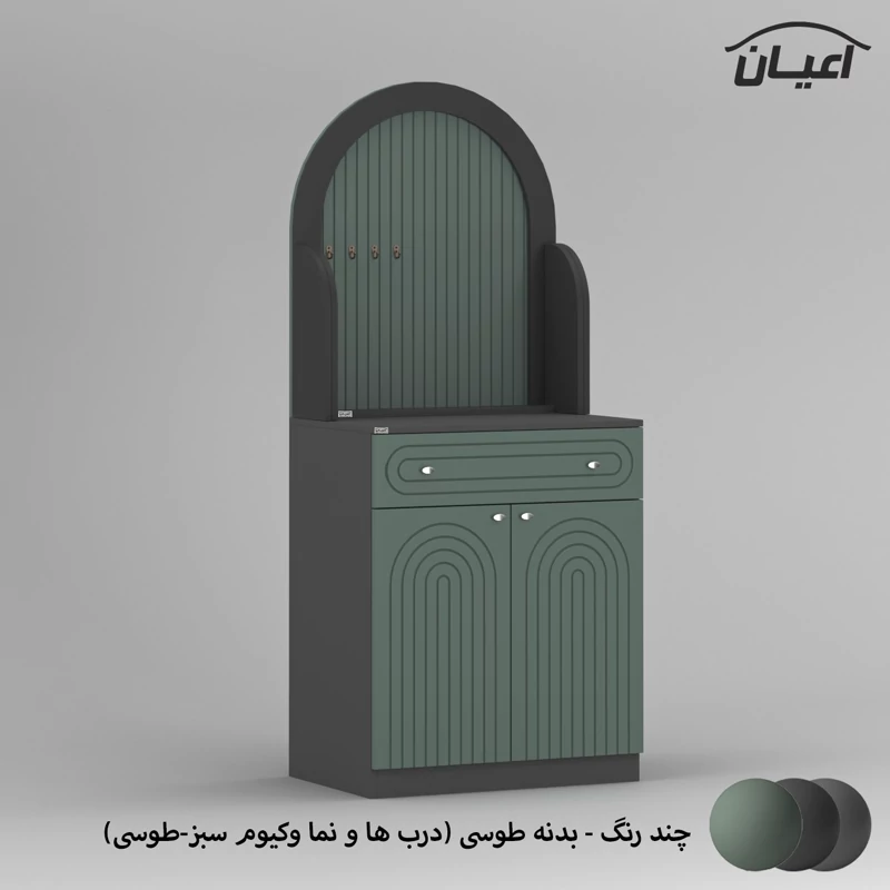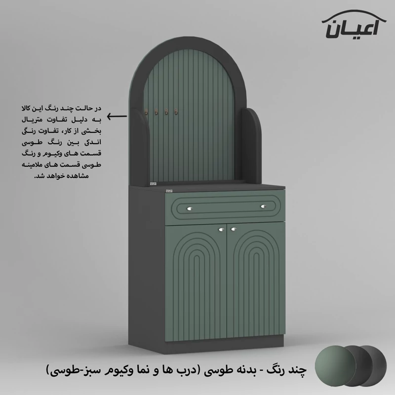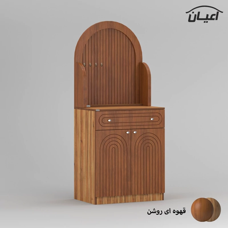 جنس بدنه مغزی نئوپان با روکش ملامینه ، جنس درب ها و نمای کار مغزی ام دی اف با روکش وکیوم و دارای طرح CNC، کالا به صورت دو تکه و فیکس نشده ارسال می شود ، قسمت پایین کار دارای یک میز کار ، یک کشو با بازشوی ریل سه تکه ساچمه ای و با دو درب کمدی با لولای آرام بند می باشد که دارای سه طبقه و چهار فضا است ، در قسمت بالا چهار عدد آویز لیوان قرار داده شده است ، نمای این کار دارای فرم منحنی و طراحی خاص منحصر به برند اعیان است.