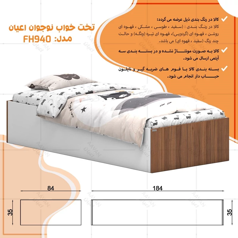 تخت خواب نوجوان اعیان ، جنس مغزی نئوپان با روکش ملامینه ، طراحی ساده و شیک ، کالا فاقد تشک می باشد ، کفی به صورت دو تکه به همراه چند جفت پایه متحرک، سایز تشک مناسب برای تخت خواب(180×80 سانتی متر) ، این کالا با رنگ بندی (سفید ، طوسی ، مشکی ، قهوه ای روشن ، قهوه ای (گردویی) ، قهوه ای تیره (ونگه) و حالت چند رنگ (سفید،قهوه ای)) تولید و عرضه می شود ، لطفا توجه داشته باشید که همواره چند درجه اختلاف رنگ بین تصاویر بارگذاری شده و کالای ساخته شده وجود دارد.