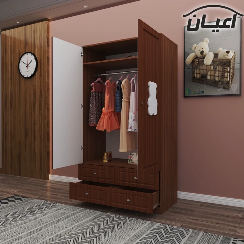کمد لباس اعیان طرح تدی.جنس نئوپان ملامینه و وکیوم(MDF با روکش PVC) .بسیار کاربردی و جادار.دارای دو درب کمدی و فضای آویز لباس در قسمت بالای رگال دارای یک طبقه به صورت ثابت است.دارای چهار کشو با ریل سه تکه - بر روی درب ها طرح تدی به صورت وکیوم وجود دارد-ارسال در بسته بندی با برند و لوگو اعیان. xهنگام خرید و دریافت کالا به بسته بندی و لوگوی برند اعیان دقت فرماییدx این کالا توسط برند اعیان در رنگ های سفید/مشکی/قهوه ای/قهوه ای روشن/ قهوه ای تیره(ونگه) و چندرنگ تولید می شود .