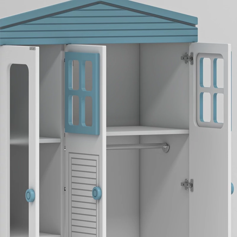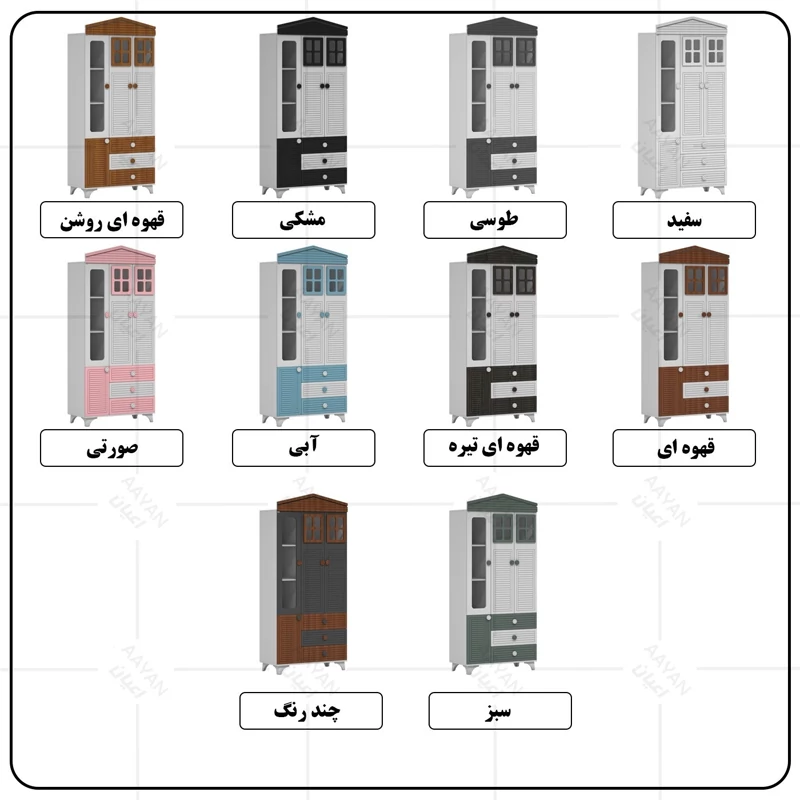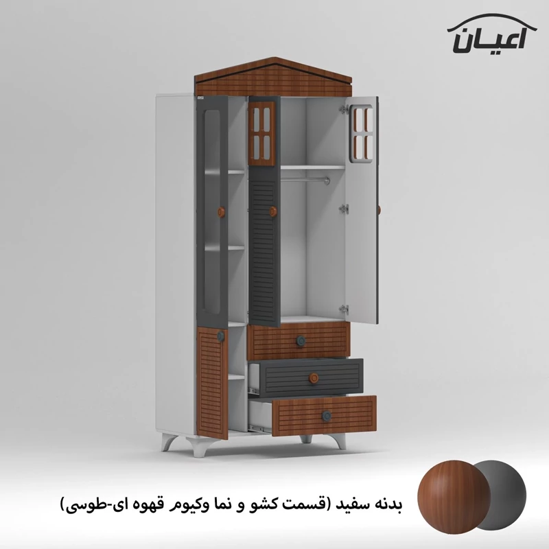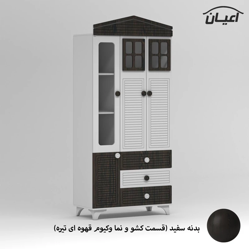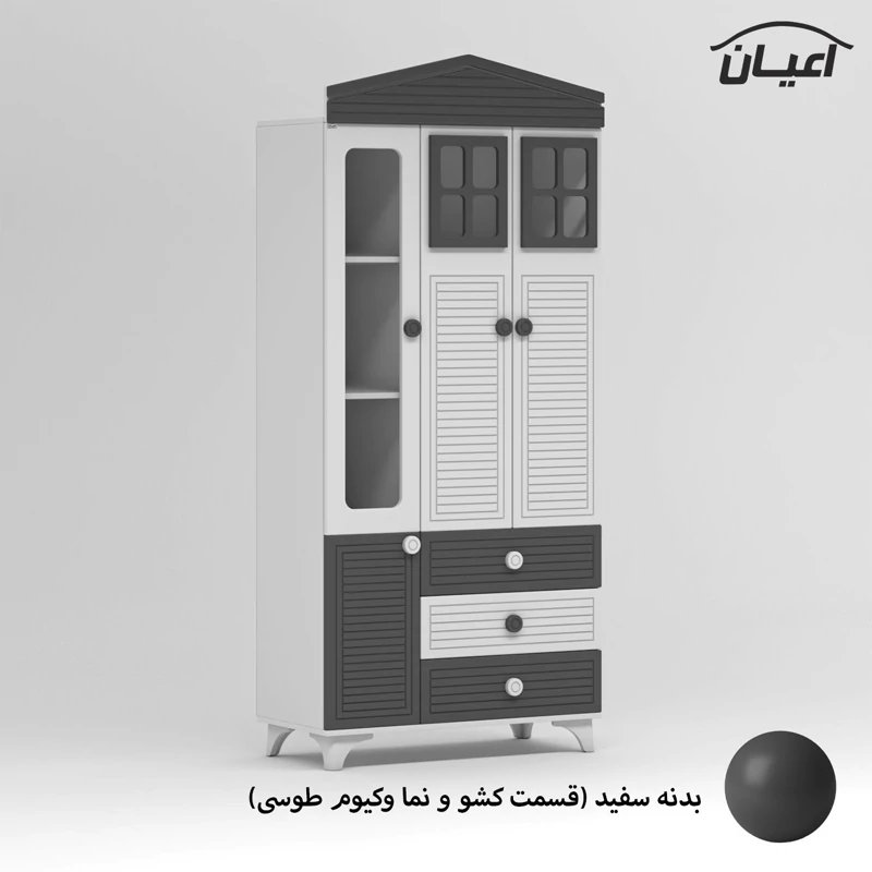 کمد لباس کودک اعیان مدل کلبه ، جنس بدنه مغزی نئوپان با روکش ملامینه و جنس درب ها مغزی ام دی اف با روکش وکیوم ، دارای دو درب کمدی با بازشوی لولای آرام بند، دارای یک طبقه ثابت داخل کمد، دارای رگال لباس، دارای یک درب ویترینی شیشه دار که فضای کتابخانه آن با دو طبقه و سه فضا تقسیم شده است ، دارای سه کشو با بازشوی ریل سه تکه ساچمه ای و یک درب کمدی کوچک با یک طبقه و دو فضا ، اینکار پایه های خفاشی دارد، این کالا در رنگ بندی : (سفید ، طوسی ، مشکی ، قهوه ای روشن ، قهوه ای (گردویی) ، قهوه ای تیره (ونگه یا قهوه ای سوخته) ،سبز ، آبی و صورتی و حالت چند رنگ (قهوه ای ، طوسی و سفید) تولید و عرضه می گردد ، بدنه ی کالا در تمامی رنگ ها سفید است و معیار انتخاب رنگ ، رنگ قسمت درب های کالا می باشد، لطفا توجه داشته باشید که همواره چند درجه اختلاف رنگ بین تصاویر بارگذاری شده و کالای ساخته شده وجود دارد.