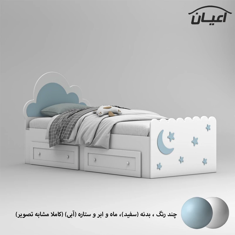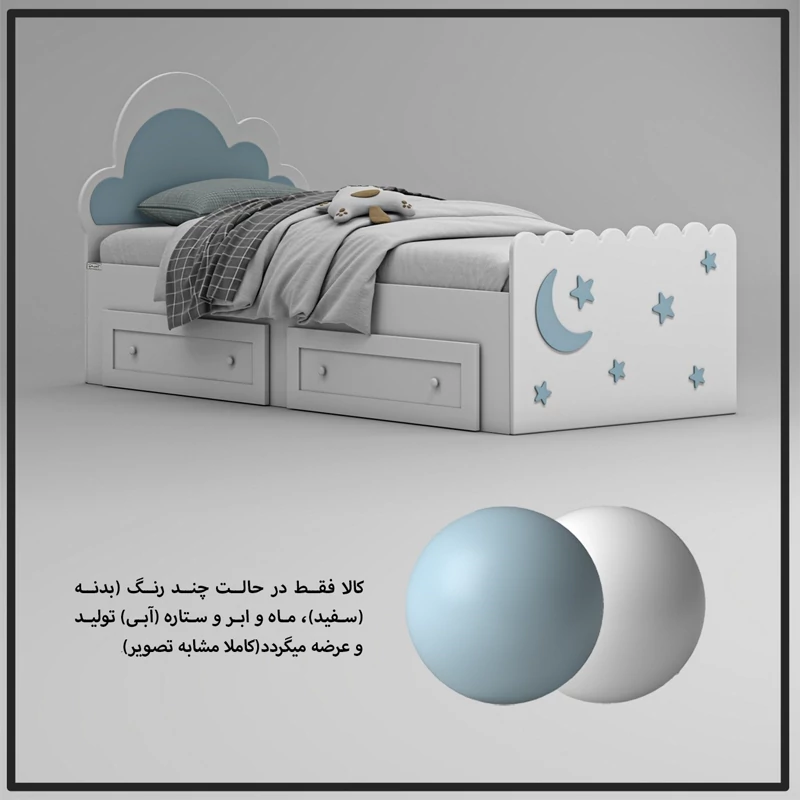 تخت خواب کودک و نوجوان اعیان ، جنس کلگی و درب کشو کالا ام دی اف با روکش وکیوم و جنس بغل تخت و کلاف داخلی کشوها نئوپان ملامینه ، طراحی ساده ، شیک و کودکانه (به شکل ابر) ، دارای دو کشو استاندارد با بازشوی چرخ چمدانی (چرخ ساکی) ، ارسال کالا به صورت مونتاژ نشده صورت می گیرد و نیاز به نصب دارد ، کالا فاقد تشک می باشد ، کفی نئوپان و به صورت دو تکه به همراه چند جفت پایه متحرک است ، سایز تشک مناسب برای تخت خواب(180×80 سانتی متر) است، این کالا فقط به صورت چند رنگ ( بدنه سفید و ماه و ابر و ستار ها آبی) تولید و عرضه می شود. این کالا را فقط با لوگو و برند اعیان تهیه کنید، لطفا توجه داشته باشید که همواره چند درجه اختلاف رنگ بین تصاویر بارگذاری شده و کالای ساخته شده وجود دارد. برای تهیه کمد لباس کودک ، ست این تخت خواب کمد لباس FH835 را در پنل برند اعیان جست و جو و انتخاب کنید.