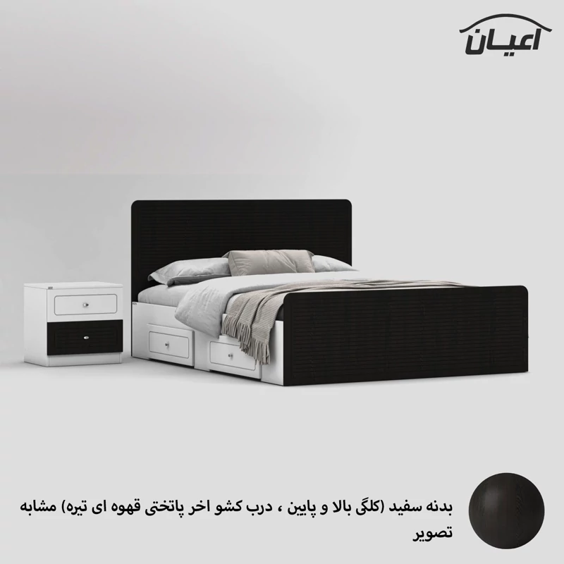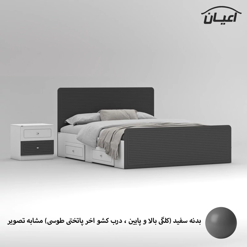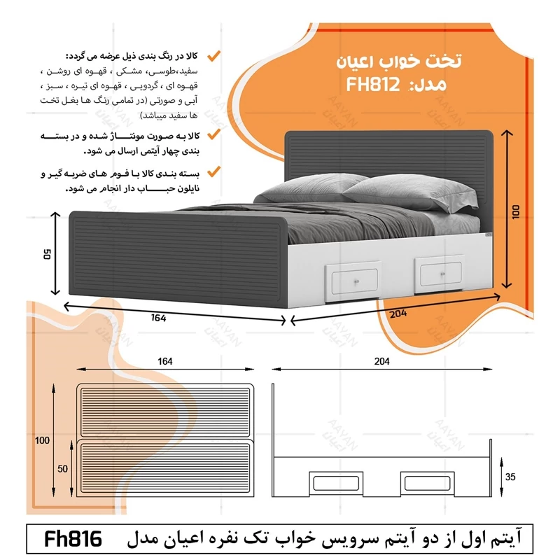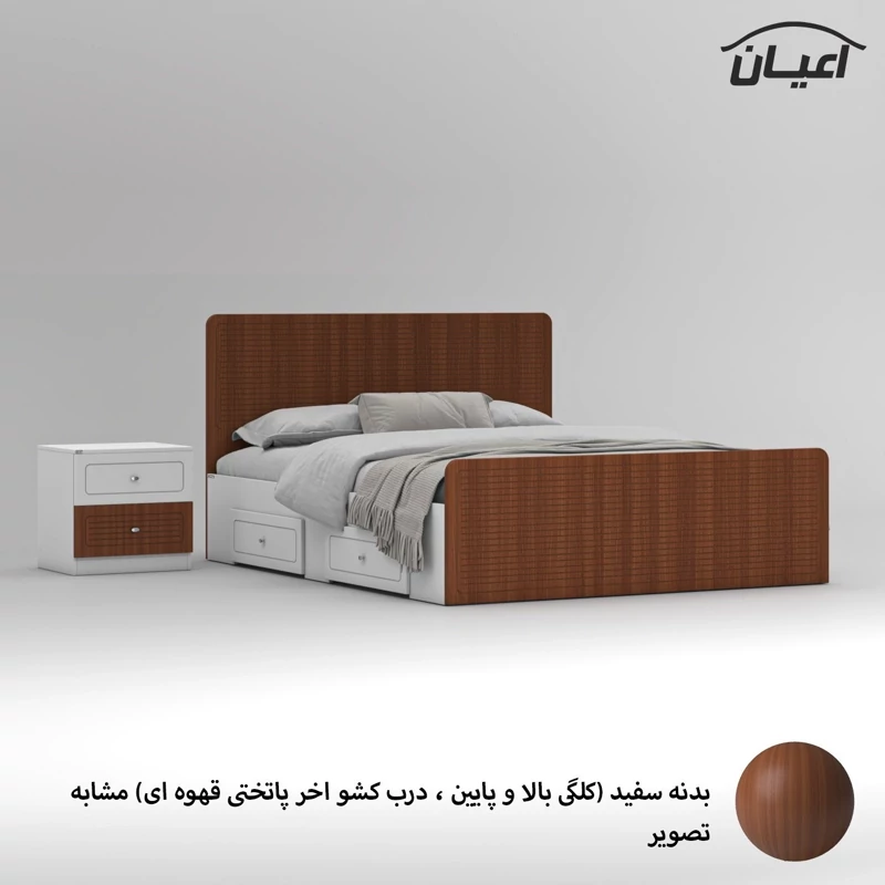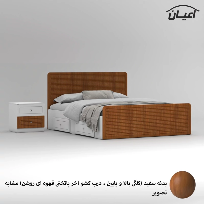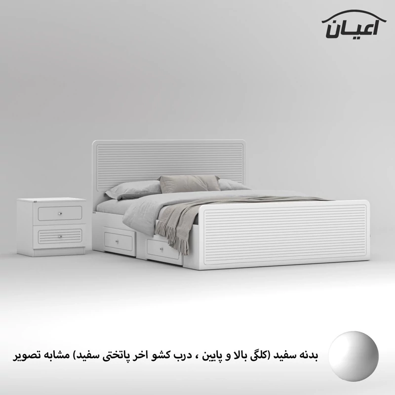 سرویس خواب دو نفره اعیان مجموعه دو عددی - آیتم اول : تخت خواب دو نفره اعیان ، جنس بدنه (بغل تخت ها) مغزی نئوپان با روکش ملامینه ، جنس کلگی بالا و پایین و درب کشو ها مغزی ام دی اف با روکش وکیوم شرکتی و دارای طرح سی ان سی است ، همچنین دارای دو کشو با چرخ ساکی بوده که قابلیت جابجایی دارند، کفی کار نئوپان بوده و همراه با چند جفت پایه متحرک ارسال می گردد، کالا فاقد تشک می باشد ، تشک مناسب این کار سایز 160x200 سانتی متر است، ارسال کالا به صورت مونتاژ نشده و در بسته بندی چهار آیتمی صورت میگرد ، آیتم دوم : پاتختی اعیان ، جنس درب کشوها : مغزی ام دی اف با روکش وکیوم است ، جنس بدنه کالا مغزی نئوپان با روکش ملامینه ، دارای دو کشو با بازشوی ریل سه تکه ساچمه ای ، ارسال به صورت مونتاژ شده است ، در نظر داشته باشید دستگیره های محصول (تخت خواب و پاتختی) به صورت تک پیچ استیل است و برای حفظ سلامت کالا و بسته بندی این دستگیره ها از داخل بسته می شود لطفا پس از بازکردن کار با استفاده از پیچ گوشتی جهت آن را تغییر دهید.این کالا را فقط با برند و لوگو اعیان تهیه کنید ، این کالا در رنگ بندی (سفید، طوسی ، مشکی ، قهوه ای روشن ، قهوه ای(گردویی) ، قهوه ای تیره(ونگه) ، سبز ، آبی و صورتی) تولید و عرضه می شود. بدنه ی کالا در تمامی رنگ ها سفید می باشد(کاملا مشابه تصاویر)، لطفا توجه فرمایید که همواره چند درجه اختلاف رنگ بین تصاویر بارگذاری شده و کالای ساخته شده وجود دارد. برای مشاهده و خرید تخت خواب به صورت جداگانه کد FH812 و برای مشاهده و خرید پاتختی به صورت جداگانه کد FH814 را انتخاب کنید.