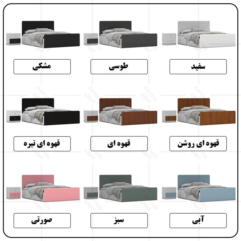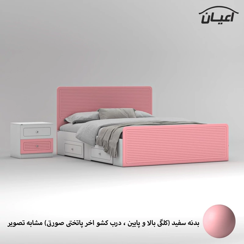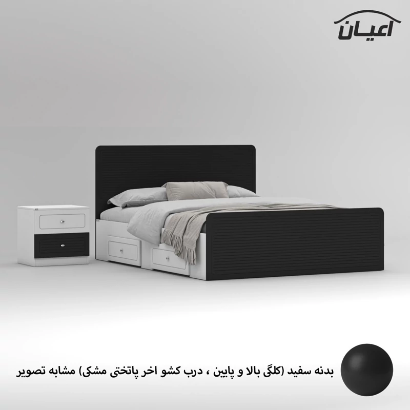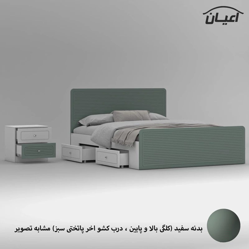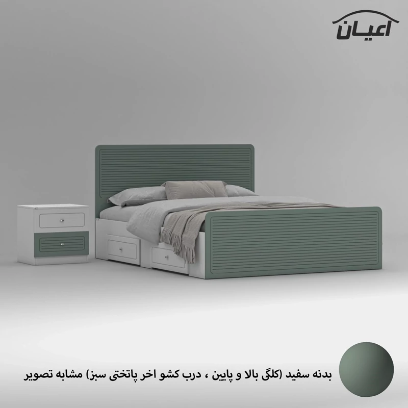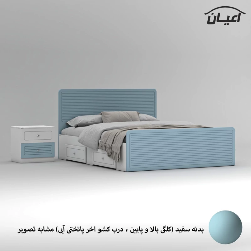 سرویس خواب دو نفره اعیان مجموعه دو عددی - آیتم اول : تخت خواب دو نفره اعیان ، جنس بدنه (بغل تخت ها) مغزی نئوپان با روکش ملامینه ، جنس کلگی بالا و پایین و درب کشو ها مغزی ام دی اف با روکش وکیوم شرکتی و دارای طرح سی ان سی است ، همچنین دارای دو کشو با چرخ ساکی بوده که قابلیت جابجایی دارند، کفی کار نئوپان بوده و همراه با چند جفت پایه متحرک ارسال می گردد، کالا فاقد تشک می باشد ، تشک مناسب این کار سایز 160x200 سانتی متر است، ارسال کالا به صورت مونتاژ نشده و در بسته بندی چهار آیتمی صورت میگرد ، آیتم دوم : پاتختی اعیان ، جنس درب کشوها : مغزی ام دی اف با روکش وکیوم است ، جنس بدنه کالا مغزی نئوپان با روکش ملامینه ، دارای دو کشو با بازشوی ریل سه تکه ساچمه ای ، ارسال به صورت مونتاژ شده است ، در نظر داشته باشید دستگیره های محصول (تخت خواب و پاتختی) به صورت تک پیچ استیل است و برای حفظ سلامت کالا و بسته بندی این دستگیره ها از داخل بسته می شود لطفا پس از بازکردن کار با استفاده از پیچ گوشتی جهت آن را تغییر دهید.این کالا را فقط با برند و لوگو اعیان تهیه کنید ، این کالا در رنگ بندی (سفید، طوسی ، مشکی ، قهوه ای روشن ، قهوه ای(گردویی) ، قهوه ای تیره(ونگه) ، سبز ، آبی و صورتی) تولید و عرضه می شود. بدنه ی کالا در تمامی رنگ ها سفید می باشد(کاملا مشابه تصاویر)، لطفا توجه فرمایید که همواره چند درجه اختلاف رنگ بین تصاویر بارگذاری شده و کالای ساخته شده وجود دارد. برای مشاهده و خرید تخت خواب به صورت جداگانه کد FH812 و برای مشاهده و خرید پاتختی به صورت جداگانه کد FH814 را انتخاب کنید.