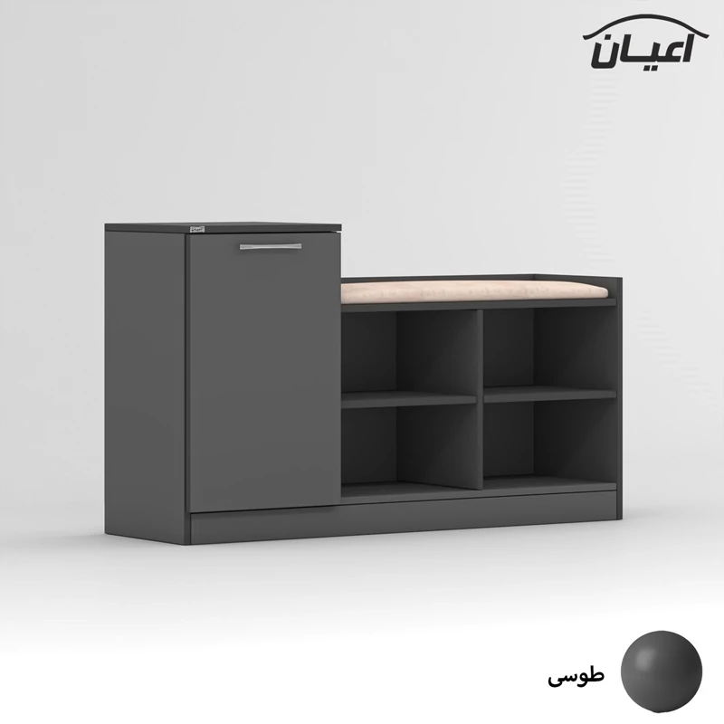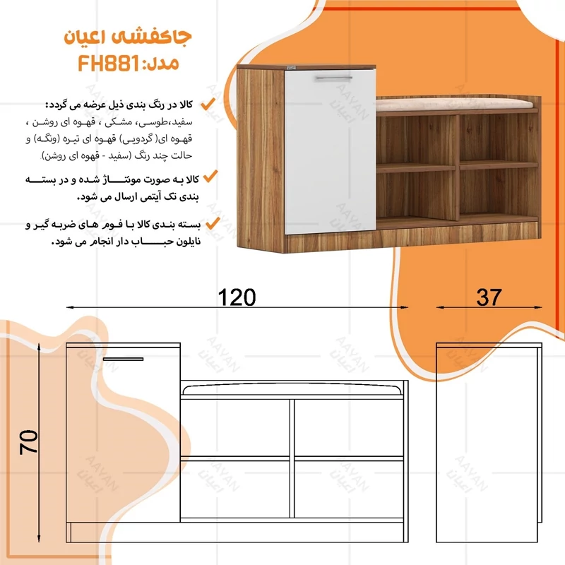 جاکفشی اعیان ، جنس : مغزی نئوپان با روکش ملامینه ، این جاکفشی دارای یک درب کمدی با لولای آرام بند با سه طبقه و چهار فضا برای قرار دادن کفش است که طبقات متحرک بوده و روی پین (خار) طبقه قرار می گیرند . درسمت راست جاکفشی یک فضای شلف مانند با چهار فضا به صورت فاق و زبانه( به فرم + ) و ثابت جهت قرار دادن کفش و اکسسوری در نظر گرفته شده است ( در نظر داشته باشید تمامی طبقات قابلیت تنظیم ارتفاع ندارند و تنها قابلیت برداشتن و قراردادن مجدد وجود دارد) ، این محصول دارای یک نشیمن است که بر روی قسمت سقف سمت راست جاکفشی قرار می گیرد که دارای لمسه ی کرمی رنگ می باشد ، دستگیره ی محصول به صورت دو پیچ استیل است و برای حفظ سلامت کالا و بسته بندی این دستگیره ها از داخل بسته می شود لطفا پس از بازکردن کار با استفاده از پیچ گوشتی جهت آن را تغییر دهید. این کالا را فقط با برند و لوگو اعیان تهیه کنید ، این کالا در رنگ بندی (سفید ، طوسی ، مشکی ، قهوه ای روشن ، قهوه ای(گردویی) ، قهوه ای تیره(ونگه) و حالت چند رنگ (مشابه تصاویر آلبوم شامل دو رنگ سفید ، قهوه ای روشن است) تولید و عرضه می گردد. جاکفشی مذکور در یک بسته بندی حباب دار با لوگوی اعیان و به صورت مونتاژ شده (نصب شده) قرار دارد . در نظر داشته باشید همواره چند درجه اختلاف رنگ بین تصاویر کالا و کالای ساخته شده وجود دارد.