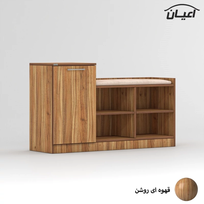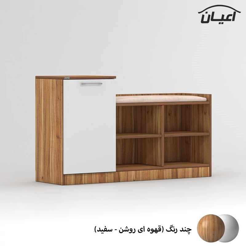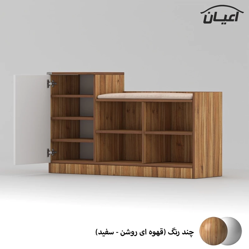 جاکفشی اعیان ، جنس : مغزی نئوپان با روکش ملامینه ، این جاکفشی دارای یک درب کمدی با لولای آرام بند با سه طبقه و چهار فضا برای قرار دادن کفش است که طبقات متحرک بوده و روی پین (خار) طبقه قرار می گیرند . درسمت راست جاکفشی یک فضای شلف مانند با چهار فضا به صورت فاق و زبانه( به فرم + ) و ثابت جهت قرار دادن کفش و اکسسوری در نظر گرفته شده است ( در نظر داشته باشید تمامی طبقات قابلیت تنظیم ارتفاع ندارند و تنها قابلیت برداشتن و قراردادن مجدد وجود دارد) ، این محصول دارای یک نشیمن است که بر روی قسمت سقف سمت راست جاکفشی قرار می گیرد که دارای لمسه ی کرمی رنگ می باشد ، دستگیره ی محصول به صورت دو پیچ استیل است و برای حفظ سلامت کالا و بسته بندی این دستگیره ها از داخل بسته می شود لطفا پس از بازکردن کار با استفاده از پیچ گوشتی جهت آن را تغییر دهید. این کالا را فقط با برند و لوگو اعیان تهیه کنید ، این کالا در رنگ بندی (سفید ، طوسی ، مشکی ، قهوه ای روشن ، قهوه ای(گردویی) ، قهوه ای تیره(ونگه) و حالت چند رنگ (مشابه تصاویر آلبوم شامل دو رنگ سفید ، قهوه ای روشن است) تولید و عرضه می گردد. جاکفشی مذکور در یک بسته بندی حباب دار با لوگوی اعیان و به صورت مونتاژ شده (نصب شده) قرار دارد . در نظر داشته باشید همواره چند درجه اختلاف رنگ بین تصاویر کالا و کالای ساخته شده وجود دارد.