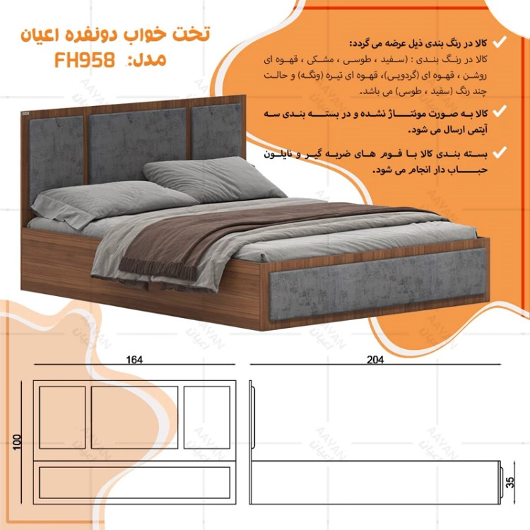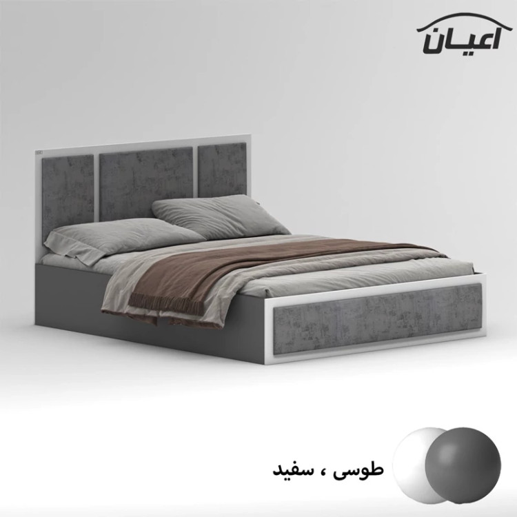 تخت خواب دو نفره اعیان ، جنس مغزی نئوپان با روکش ملامینه ، طرحی ساده ، شیک و ترکیب با لمسه طوسی ، کالا فاقد تشک می باشد ، کفی به صورت سه تکه به همراه چند جفت پایه متحرک، سایز تشک مناسب برای تخت خواب(200×160 سانتی متر) ، این کالا با رنگ بندی (سفید ، طوسی ، مشکی ، قهوه ای روشن ، قهوه ای (گردویی) ، قهوه ای تیره (ونگه) و حالت چند رنگ (طوسی،سفید) ) تولید و عرضه می شود ، این کالا را فقط با لوگو و برند اعیان تهیه کنید، لطفا توجه داشته باشید که همواره چند درجه اختلاف رنگ بین تصاویر بارگذاری شده و کالای ساخته شده وجود دارد.