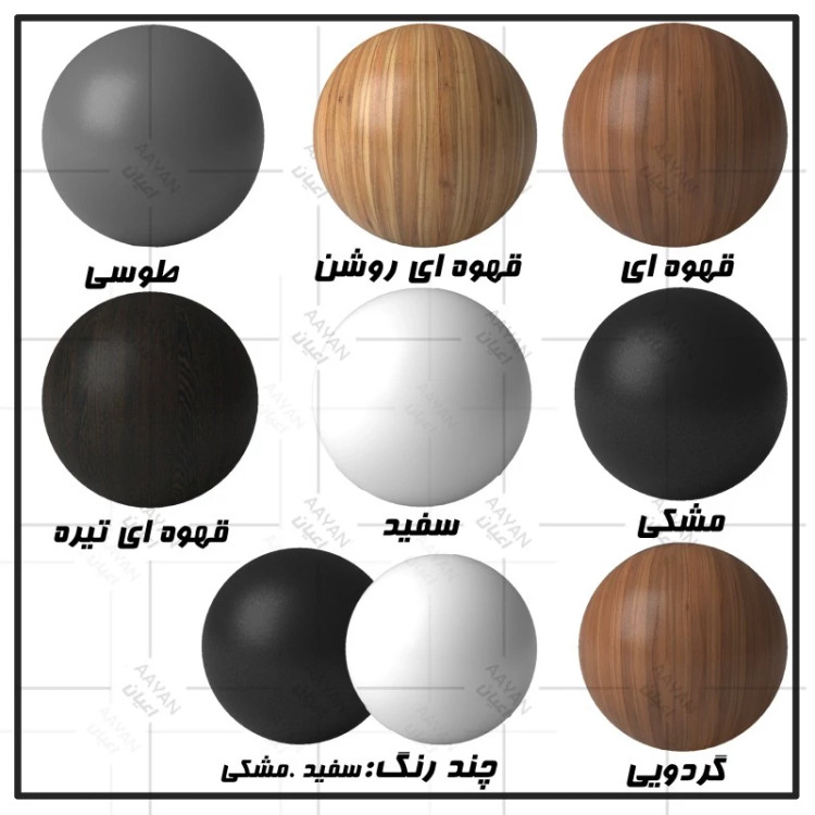 این کالا توسط برند اعیان در رنگ های سفید/مشکی/قهوه ای/گردویی/قهوه ای روشن/قهوه ای تیره(ونگه) /طوسی و حالت چند رنگ که مشابه تصاویر آلبوم محصول تولید می شود .